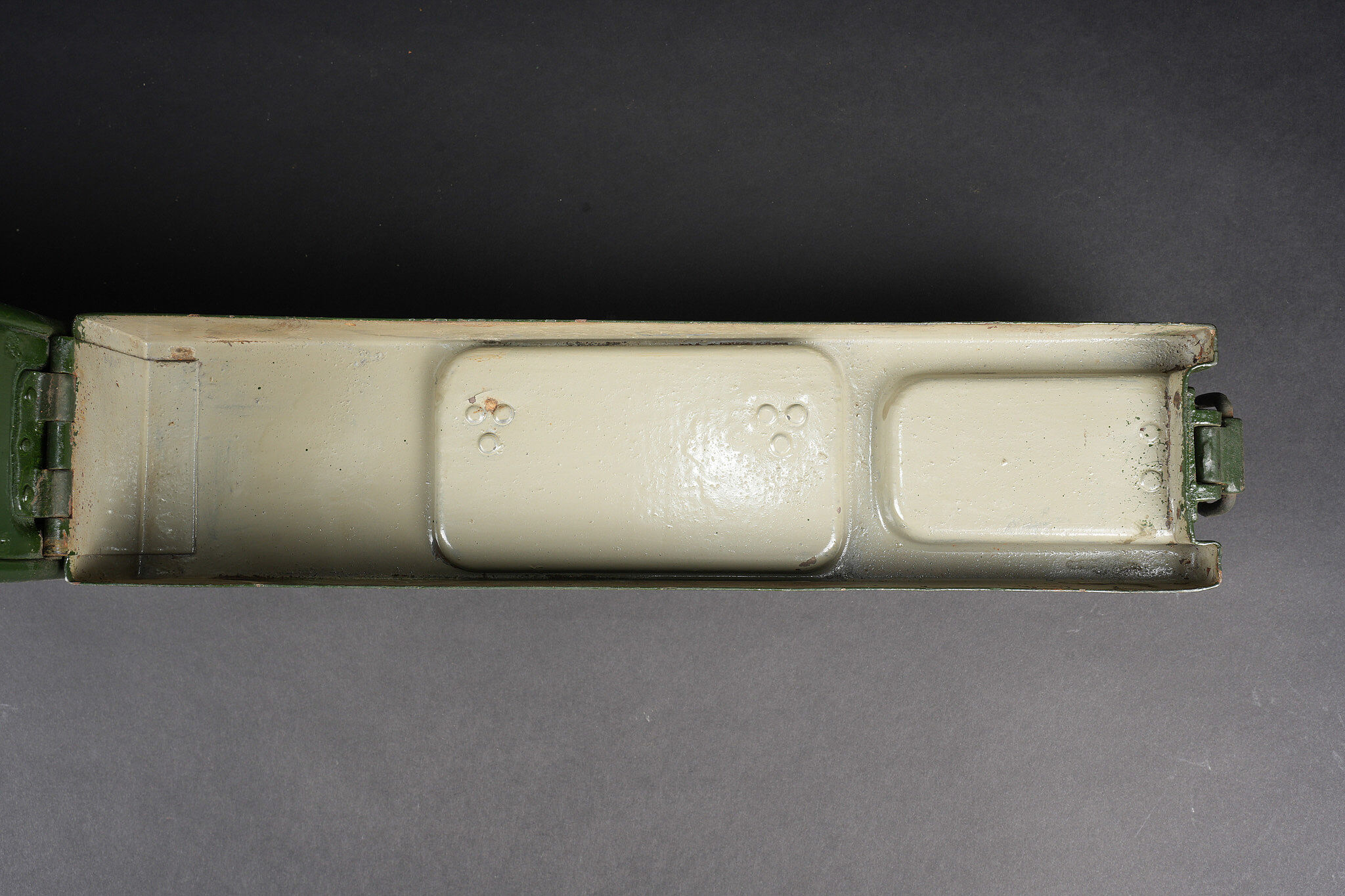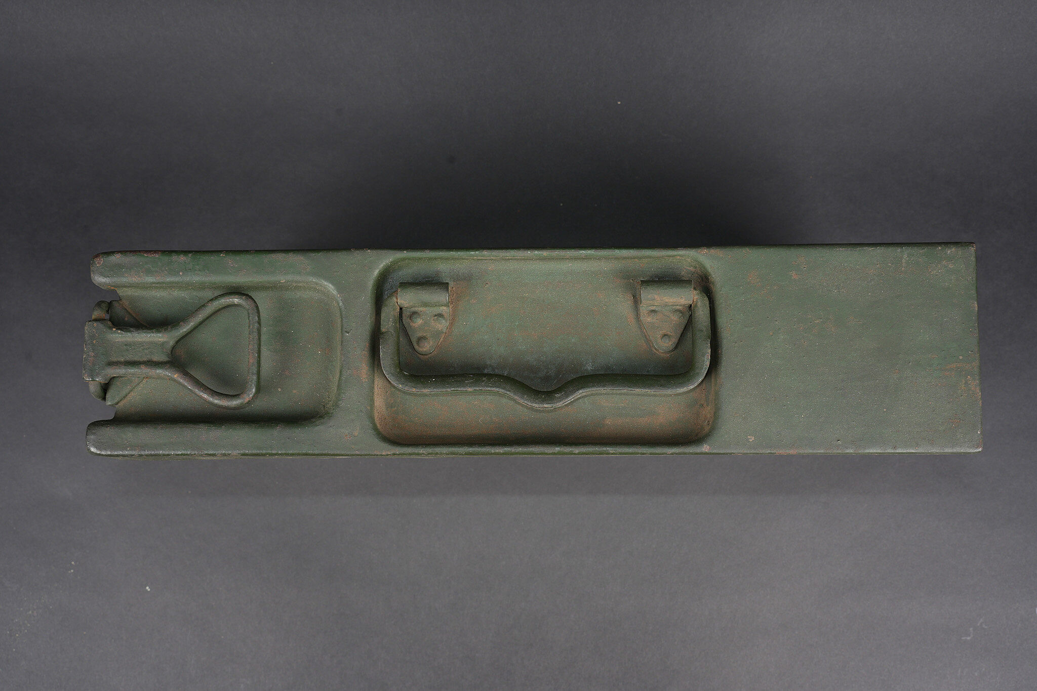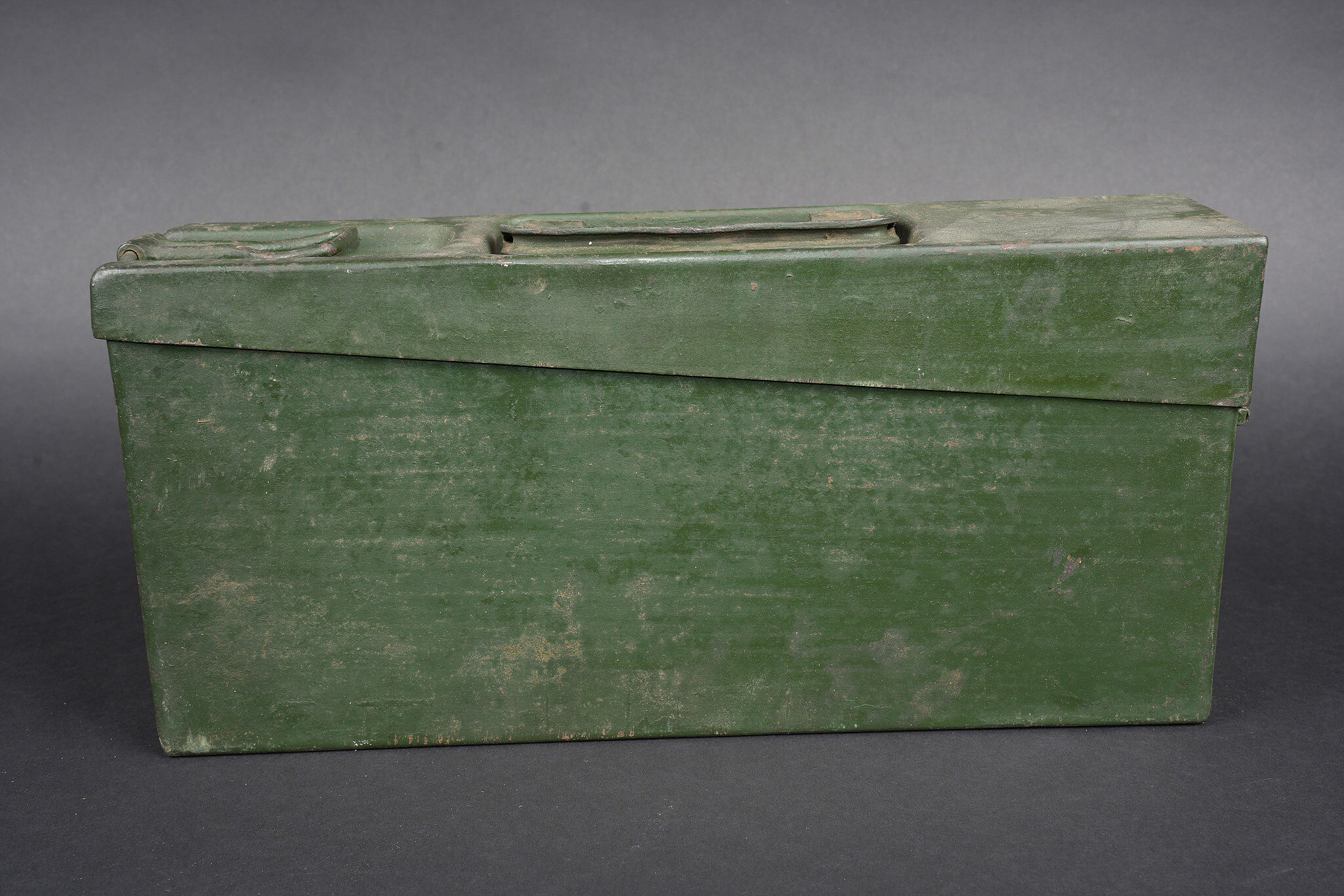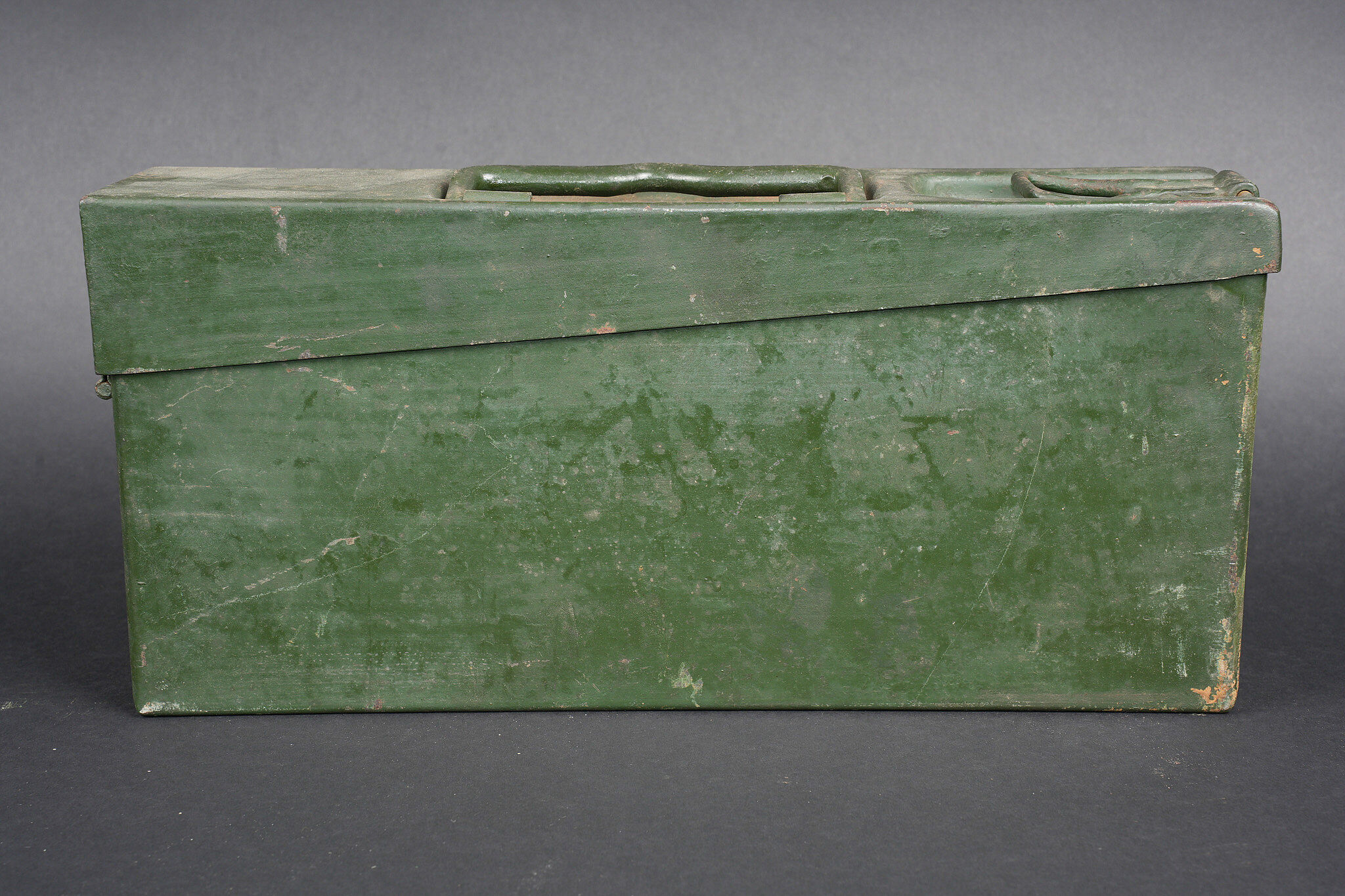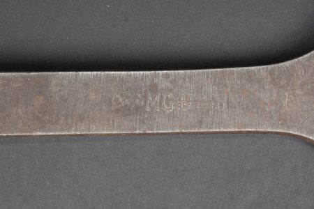 Clé et caisses pour munitions de mitrailleuse allemande ww1 MG08. Clé outil multifonction du 1er type en bel état. Caisse double, fermoir manquant. Caisse simple repeinte. Usure d’usage, patine. German MG08 ammunition tool set including one first pattern multifunction wrench in fine condition, one double ammunition box missing clasp, and one single box repainted. Service wear and patina.