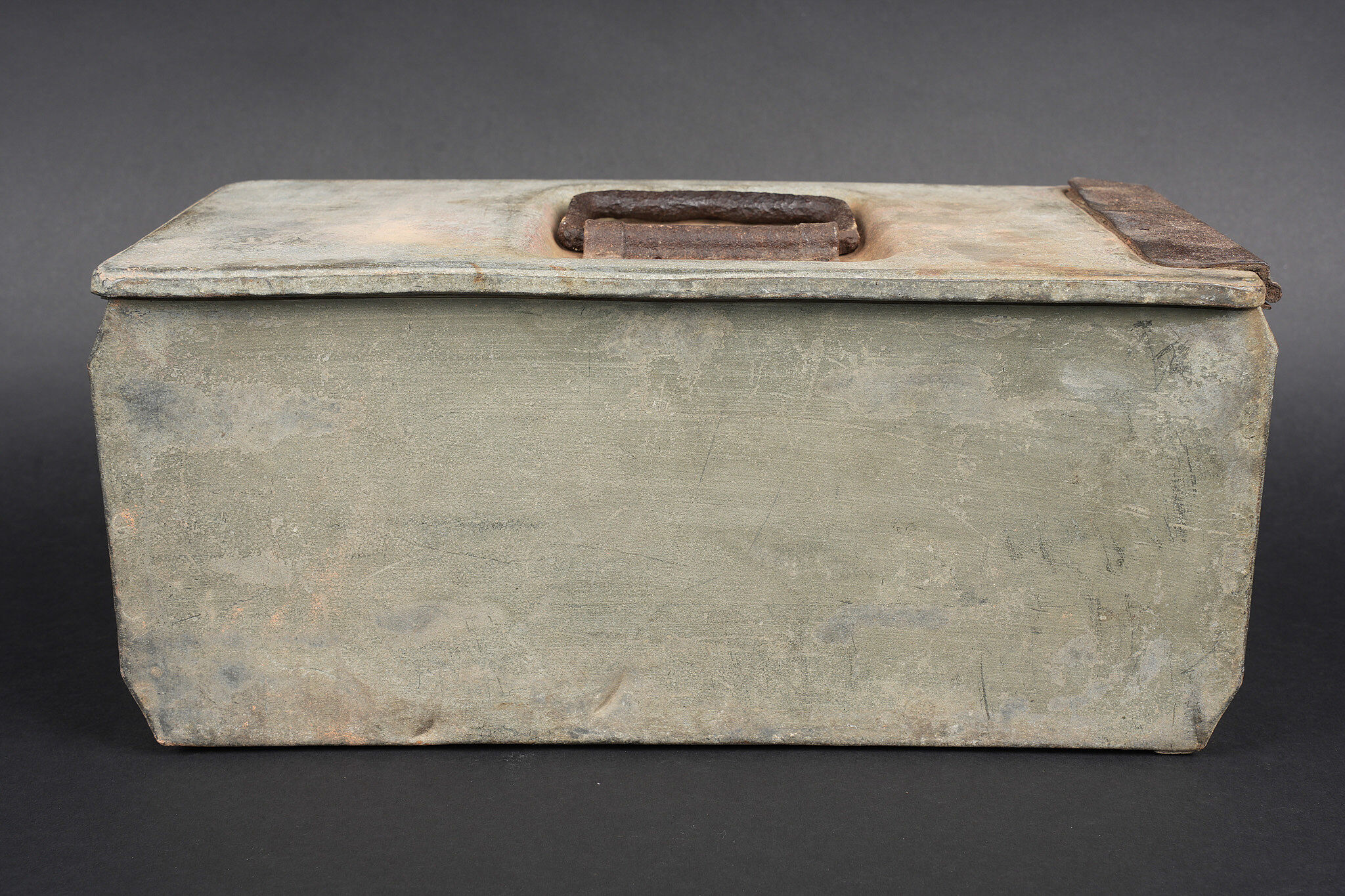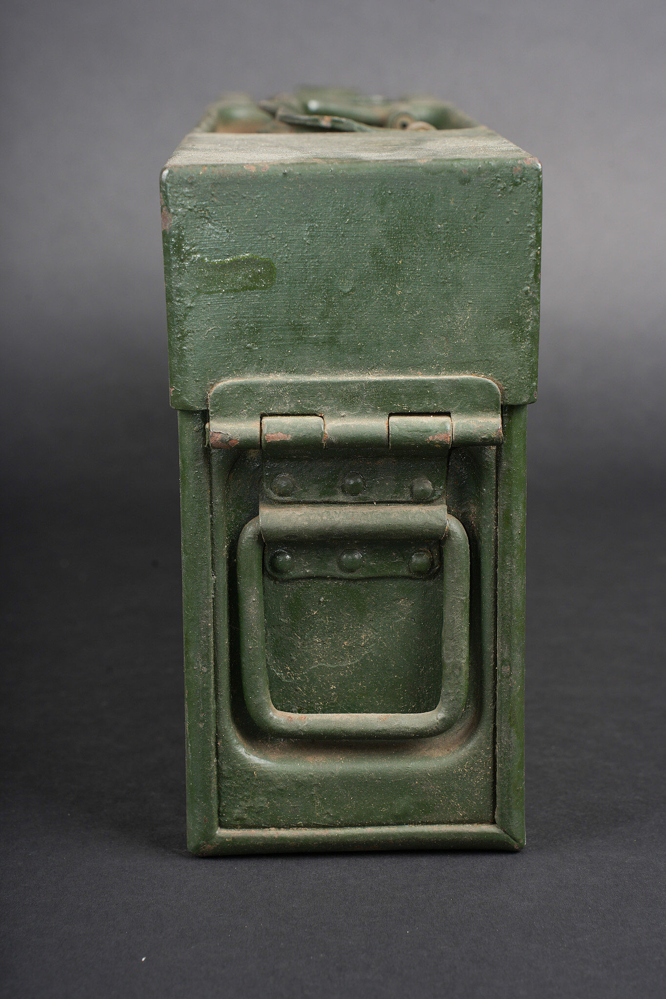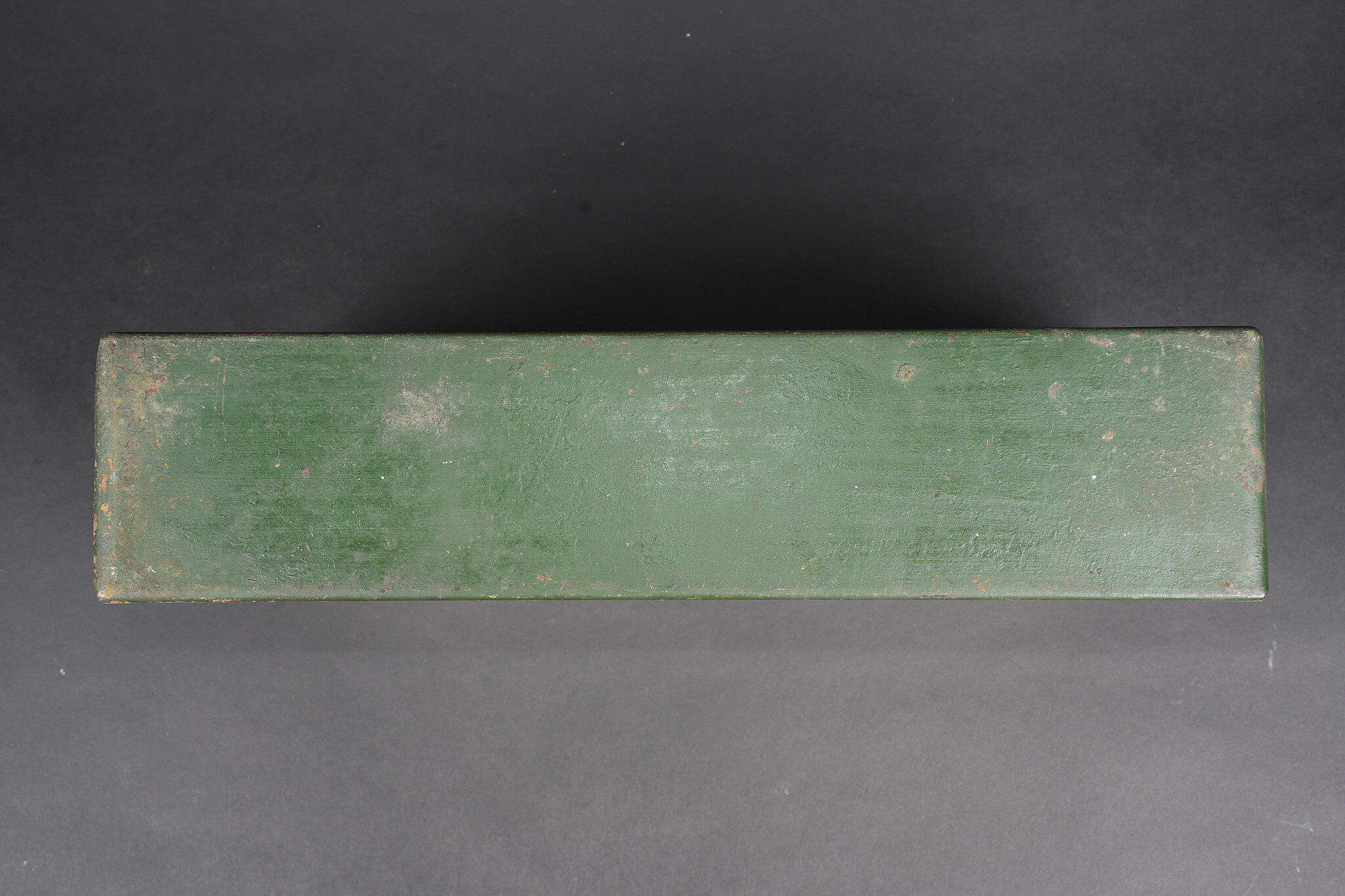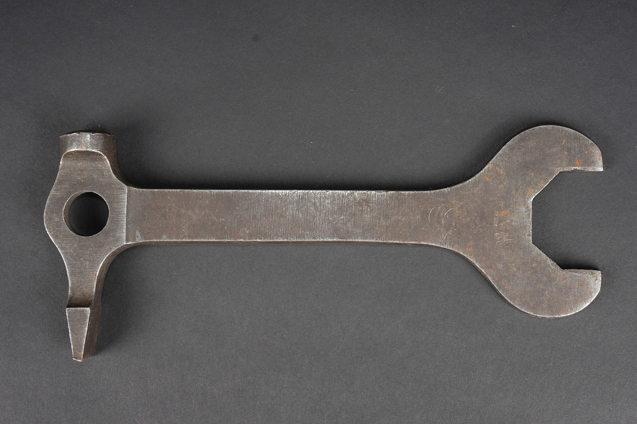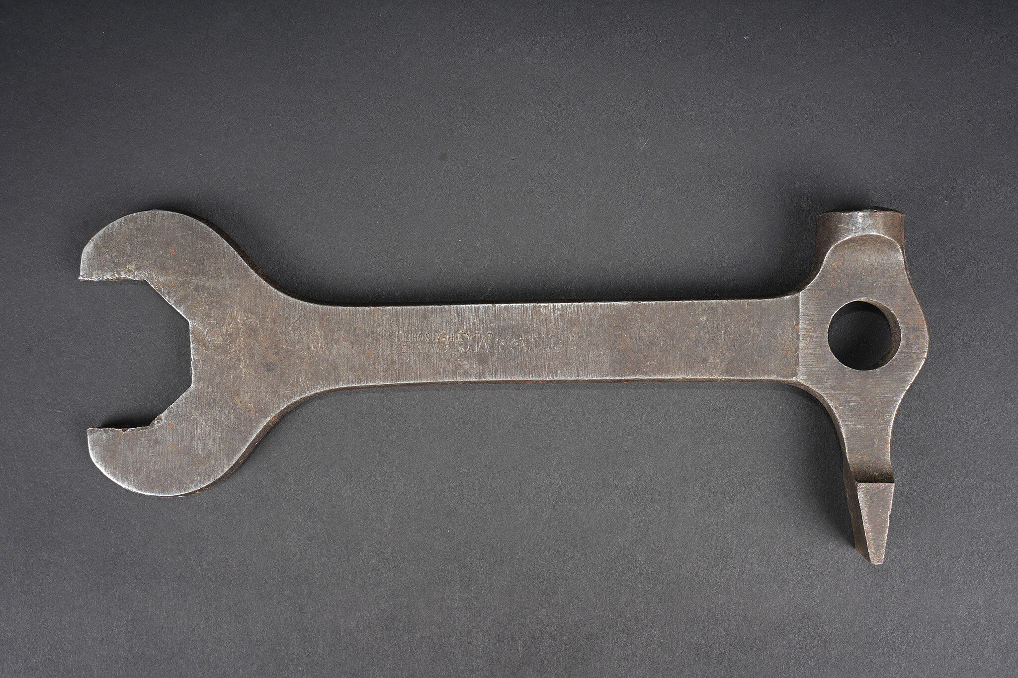 Clé et caisses pour munitions de mitrailleuse allemande ww1 MG08. Clé outil multifonction du 1er type en bel état. Caisse double, fermoir manquant. Caisse simple repeinte. Usure d’usage, patine. German MG08 ammunition tool set including one first pattern multifunction wrench in fine condition, one double ammunition box missing clasp, and one single box repainted. Service wear and patina.