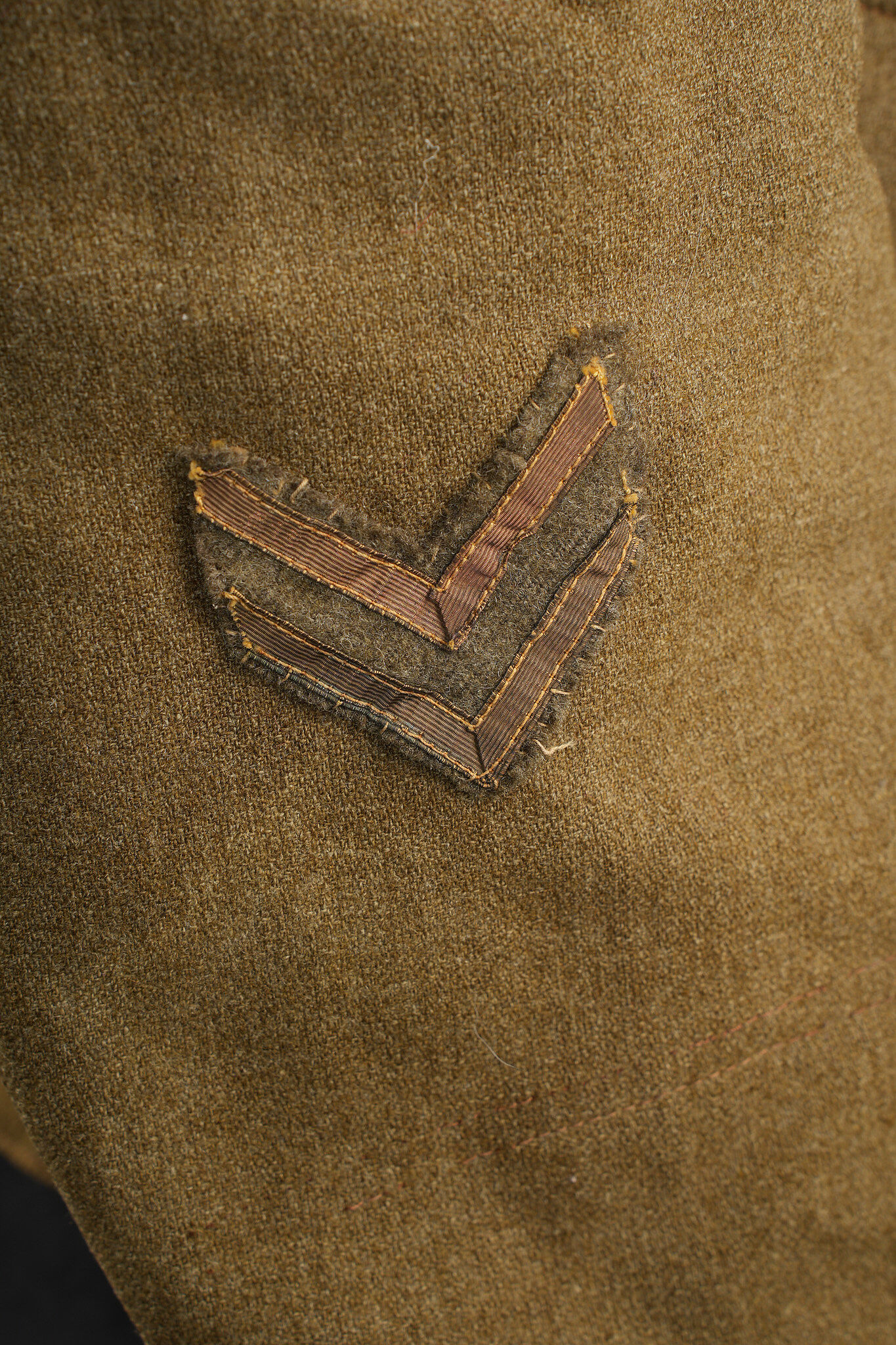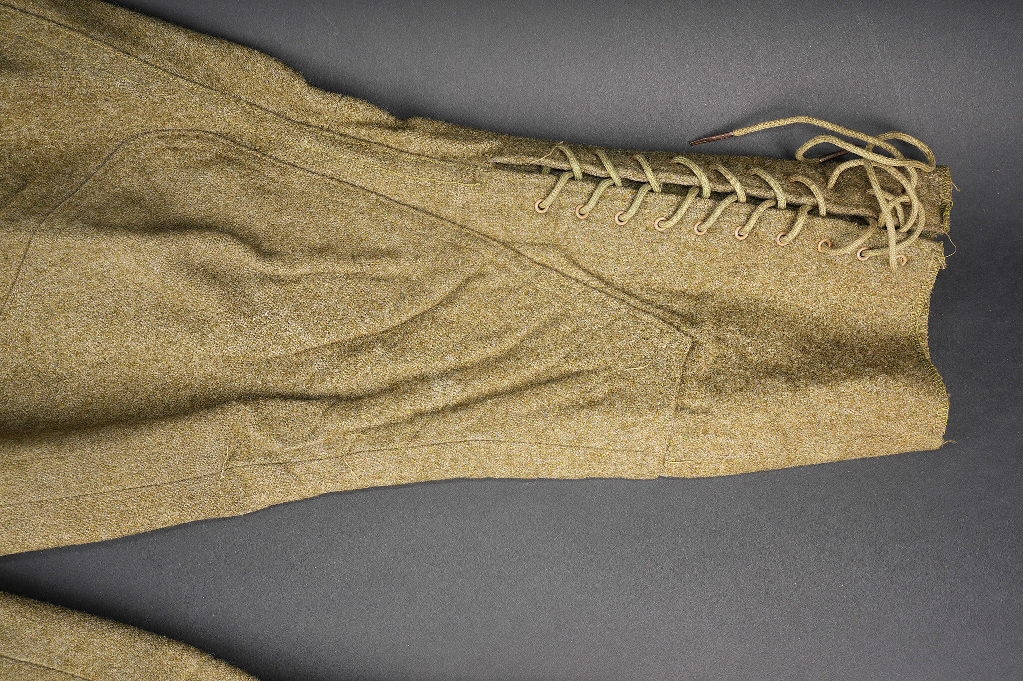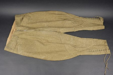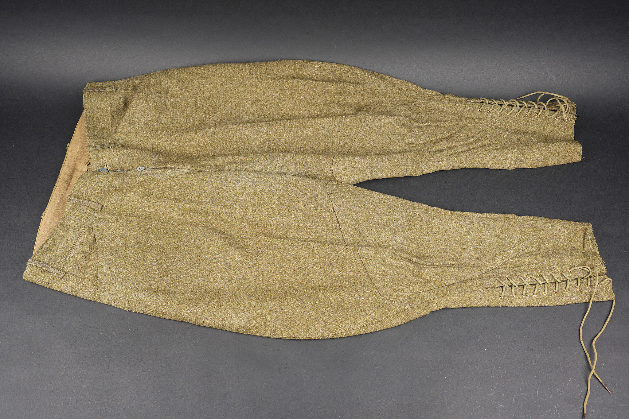 Uniforme US ww1 d’un aviateur du Air Service avec Navy Pilot Wings. Composé d’une vareuse modèle 1912 en drap léger. Etiquette sous la doublure du fabricant Sigmund Eisner, contrat de juin 1915. Sur le col droit, collar disks US et Air Service, à côté de l’air service, un peu courant collar type officier du Air Service, fabrication française, adopté en France brièvement au printemps 1918 jusque juillet, fixation épingle horizontale. Sur l’épaule gauche, insigne du District of Paris. Sur la manche droite un insigne tissu de Sergeant du Air Service et au bas de la manche, 2 chevrons de blessures. Au dessus de la poche de poitrine gauche, des wings d’aviateur de la Navy en canetille sur drap noir. Doublure coton avec un matricule manuscrit sur le dos. Usure d’usage, quelques accrocs minimes. Une culotte 1917 avec renforts, étiquette The Edward Tailoring Co, contrat de novembre 1917 en bel état. US WWI United States Army Air Service aviator uniform with United States Navy pilot wings, consisting of one model 1912 tunic in lightweight wool with label under the lining by Sigmund Eisner under June 1915 contract. Right collar fitted with US and Air Service collar disks, beside them a scarce officer type Air Service insignia of French manufacture adopted briefly in France during spring 1918 until July, with horizontal pin fastening. Left shoulder bears District of Paris insignia. Right sleeve carries Sergeant insignia of the Air Service and two wound chevrons at the cuff. Above the left breast pocket are Navy aviator wings in bullion on black cloth. Cotton lining with handwritten service number on the back. Light service wear with minor snags. Accompanied by one model 1917 breeches with reinforcements, labelled The Edward Tailoring Co. under November 1917 contract, in very good condition.