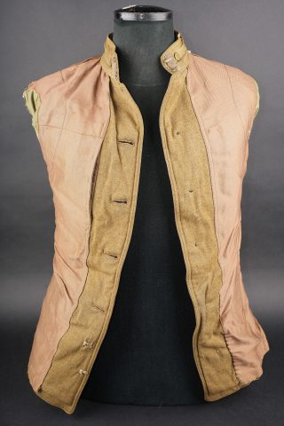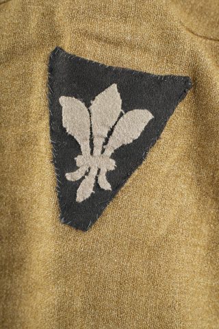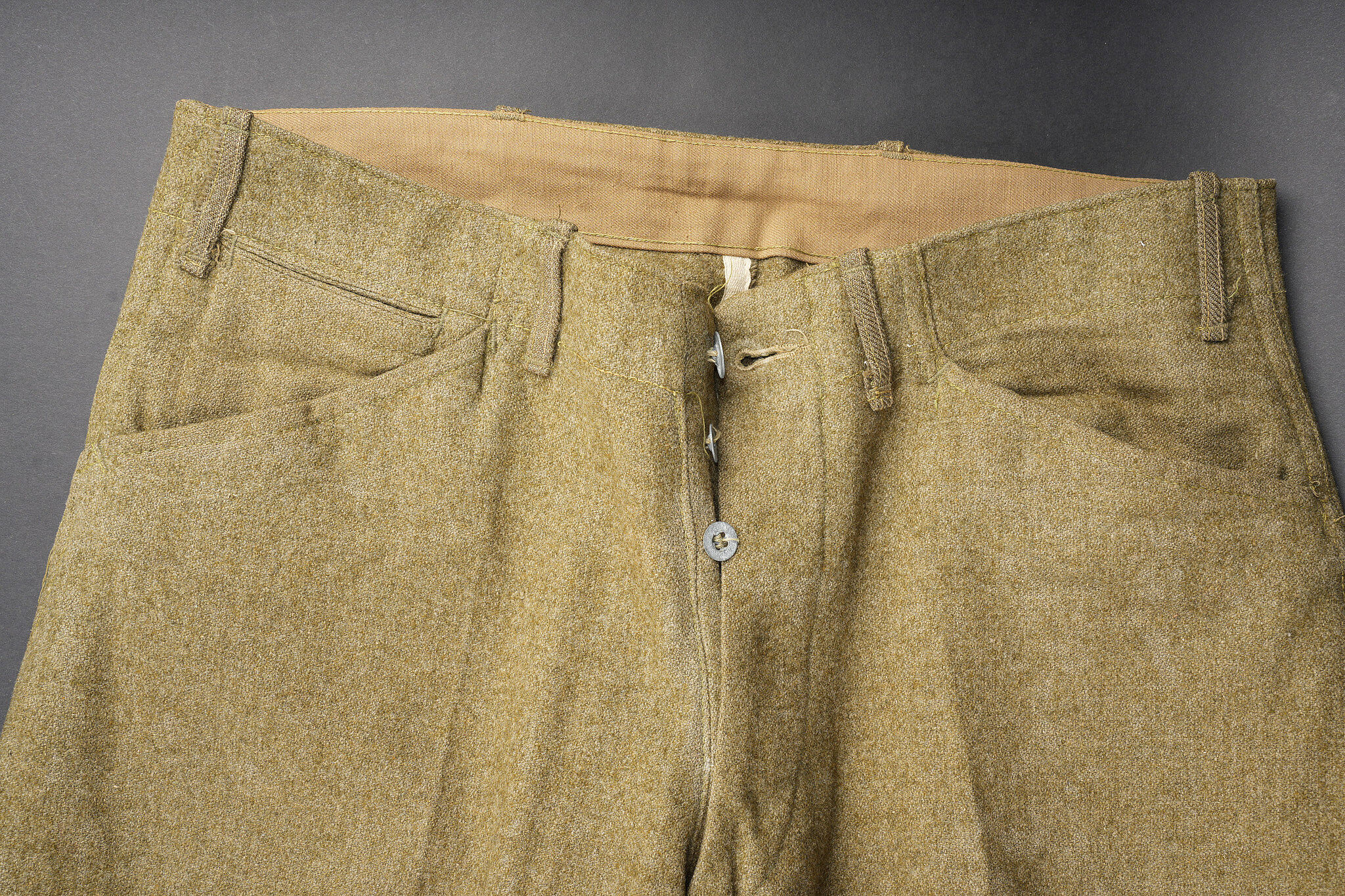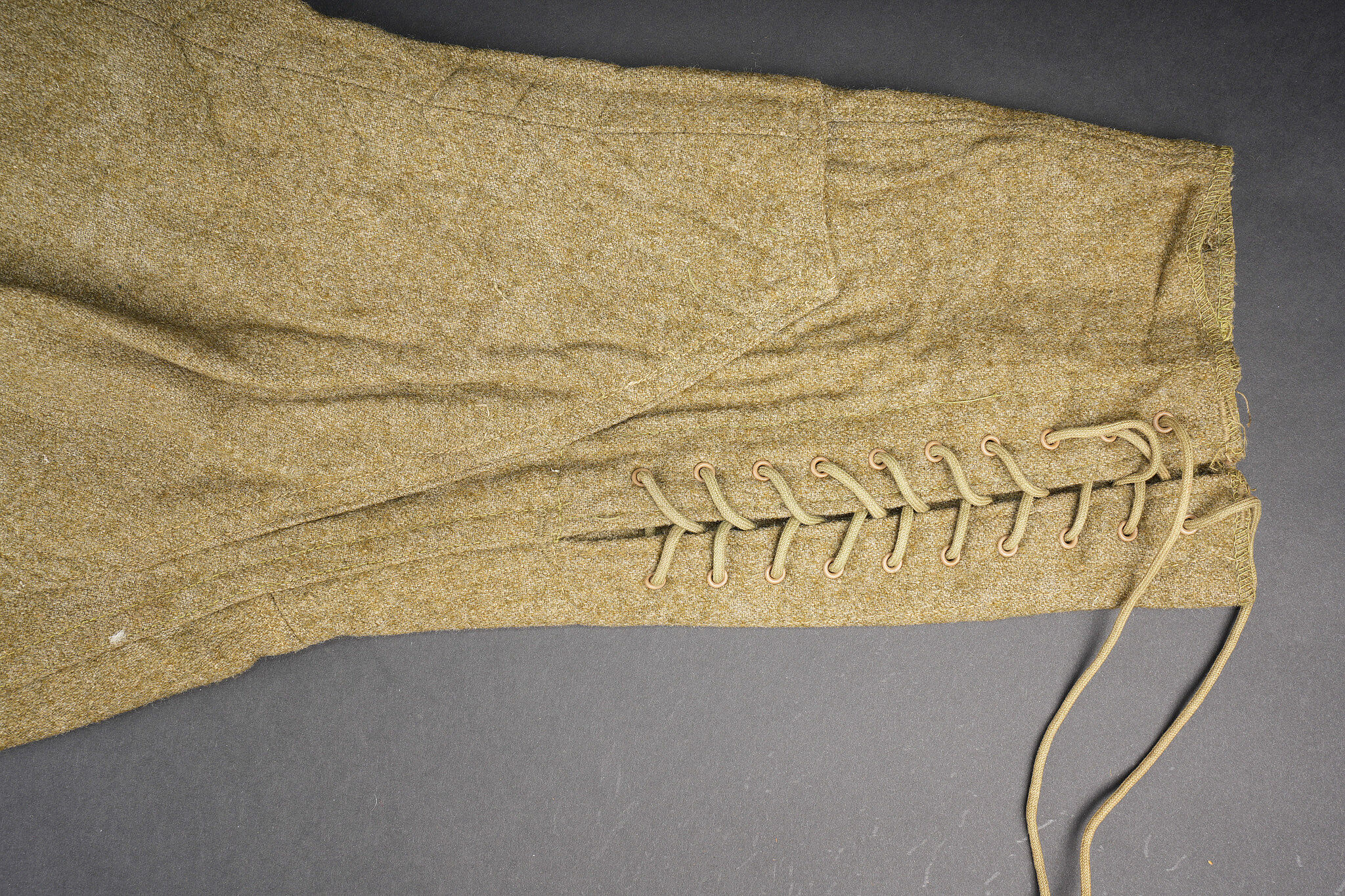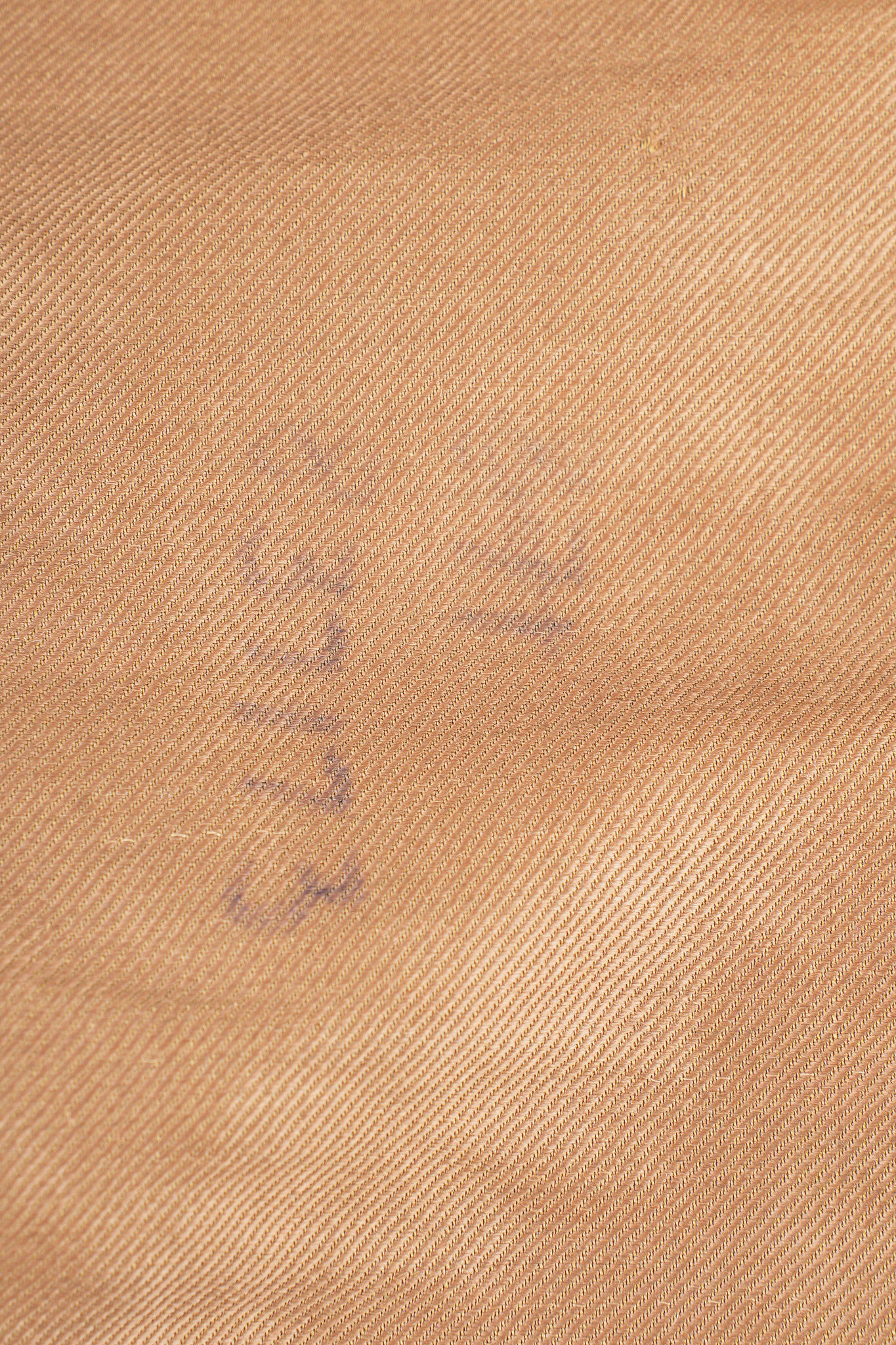 Uniforme US ww1 d’un aviateur du Air Service avec Navy Pilot Wings. Composé d’une vareuse modèle 1912 en drap léger. Etiquette sous la doublure du fabricant Sigmund Eisner, contrat de juin 1915. Sur le col droit, collar disks US et Air Service, à côté de l’air service, un peu courant collar type officier du Air Service, fabrication française, adopté en France brièvement au printemps 1918 jusque juillet, fixation épingle horizontale. Sur l’épaule gauche, insigne du District of Paris. Sur la manche droite un insigne tissu de Sergeant du Air Service et au bas de la manche, 2 chevrons de blessures. Au dessus de la poche de poitrine gauche, des wings d’aviateur de la Navy en canetille sur drap noir. Doublure coton avec un matricule manuscrit sur le dos. Usure d’usage, quelques accrocs minimes. Une culotte 1917 avec renforts, étiquette The Edward Tailoring Co, contrat de novembre 1917 en bel état. US WWI United States Army Air Service aviator uniform with United States Navy pilot wings, consisting of one model 1912 tunic in lightweight wool with label under the lining by Sigmund Eisner under June 1915 contract. Right collar fitted with US and Air Service collar disks, beside them a scarce officer type Air Service insignia of French manufacture adopted briefly in France during spring 1918 until July, with horizontal pin fastening. Left shoulder bears District of Paris insignia. Right sleeve carries Sergeant insignia of the Air Service and two wound chevrons at the cuff. Above the left breast pocket are Navy aviator wings in bullion on black cloth. Cotton lining with handwritten service number on the back. Light service wear with minor snags. Accompanied by one model 1917 breeches with reinforcements, labelled The Edward Tailoring Co. under November 1917 contract, in very good condition.