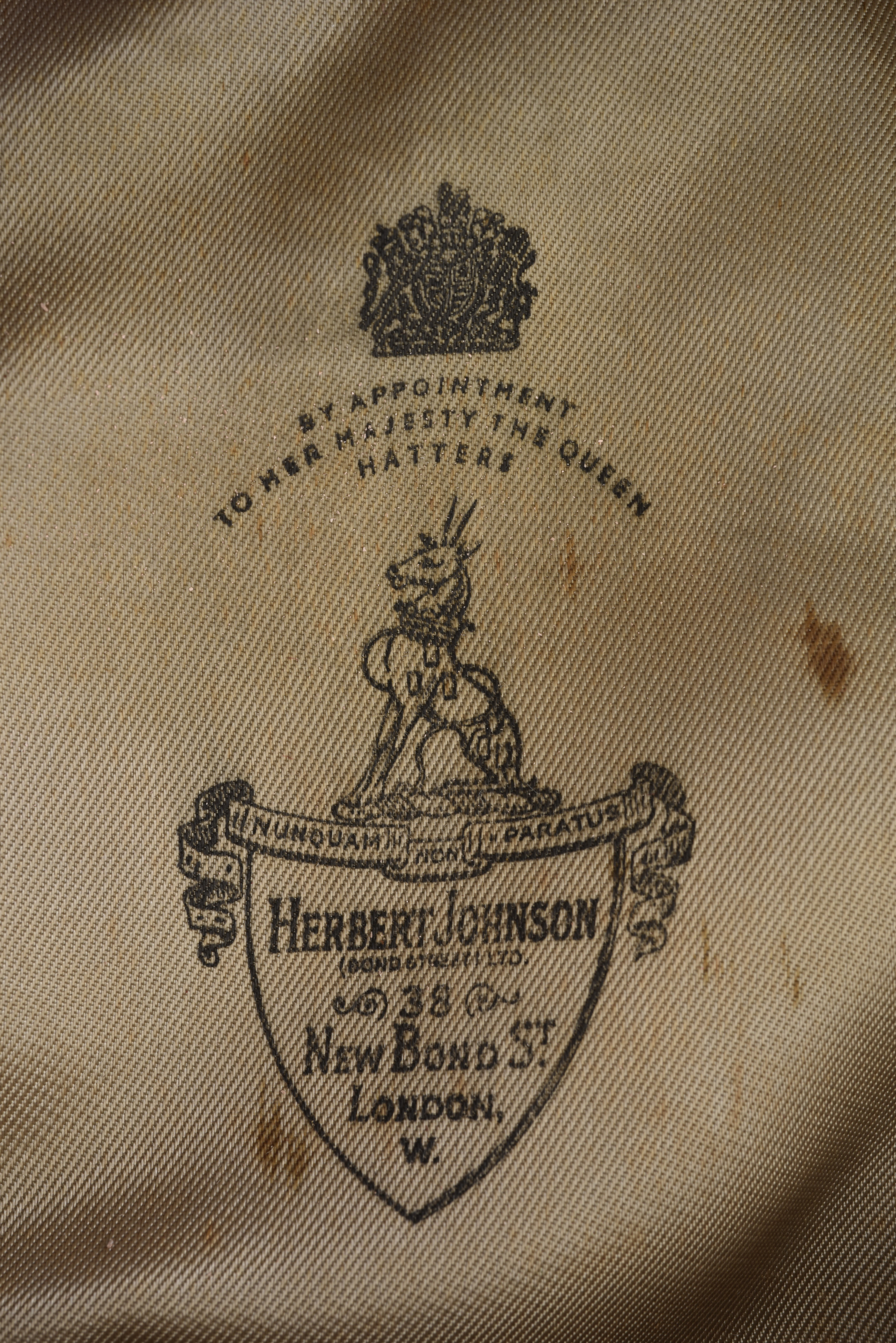 En gabardine kaki, bandeau rouge sang. Insigne de grade en cannetille or. Intérieur en satinette grise. Fabrication « Herbert Johnson London ». Bandeau de transpiration en cuir marron. A... en savoir plus