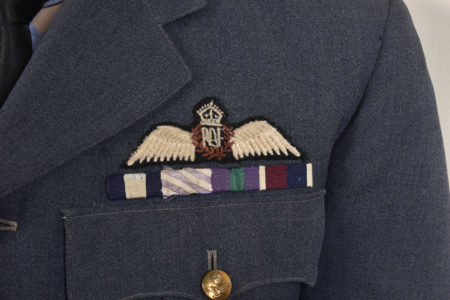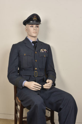Comprenant un mannequin complet type Pintus. Un pantalon en gabardine bleue sans marquages. Une vareuse quatre poche avec une barrette de quatre rubans de décoration. Brevet de pilote non garanti... en savoir plus