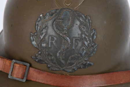 Modèle 1926 kaki, avec attribut modèle 1915 du Service de Santé peint en bleu. Complet