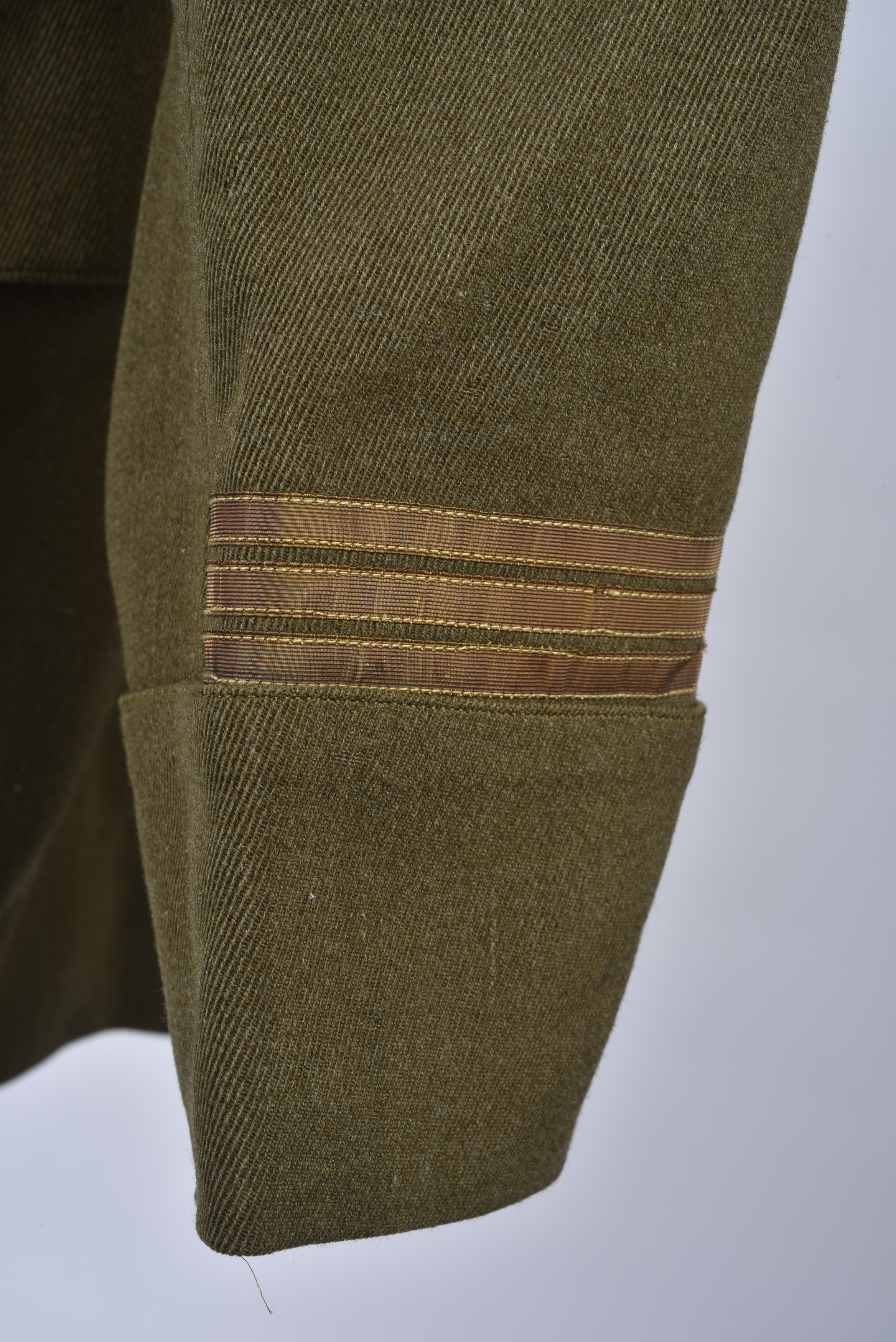 Allons de grade cousus sur le bas des manches, rangée de 7 boutons à l’ancre, insigne de col à la grenades en fil d’or sur fond de drap garance, et un pantalon à bandes.