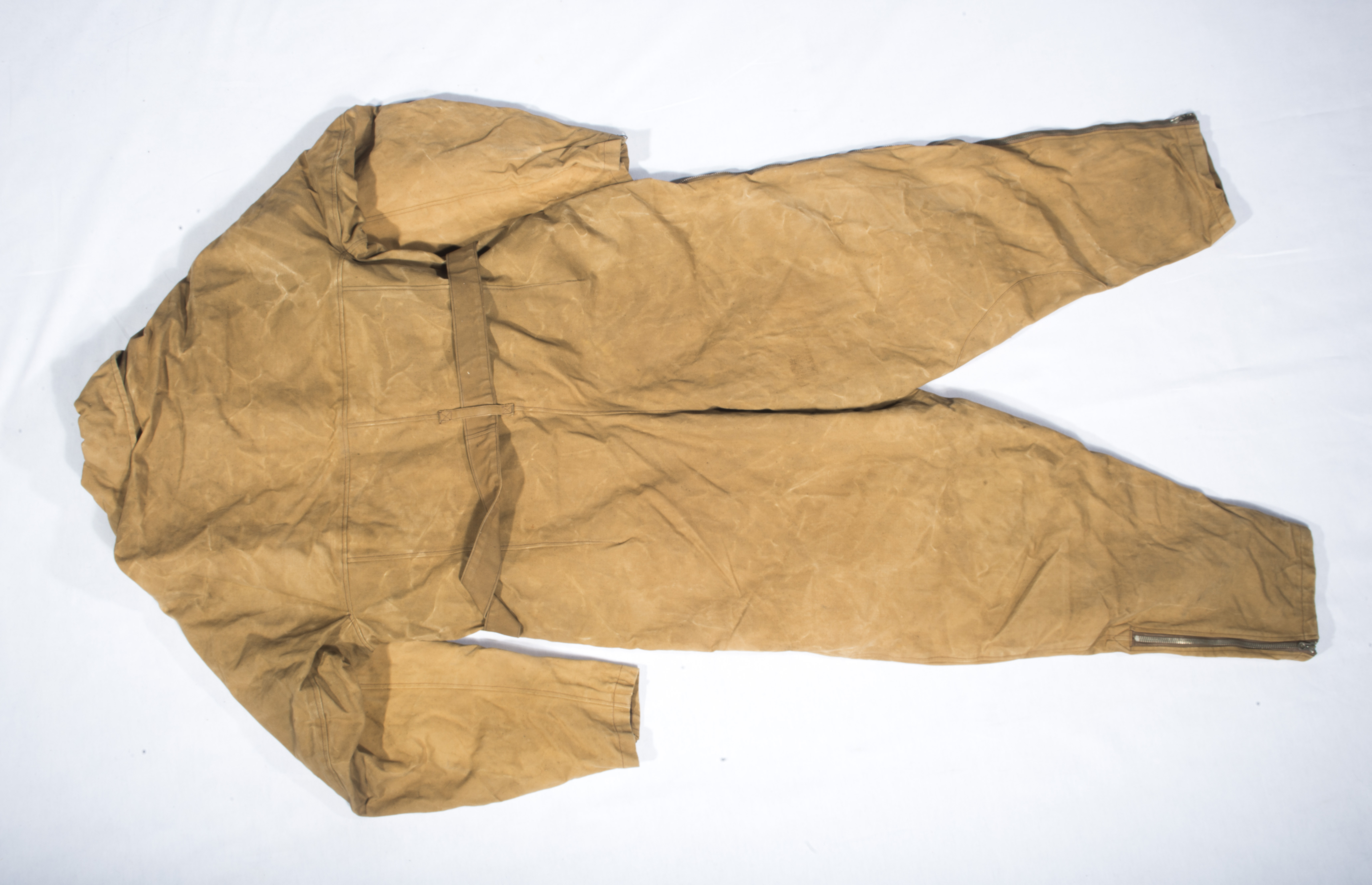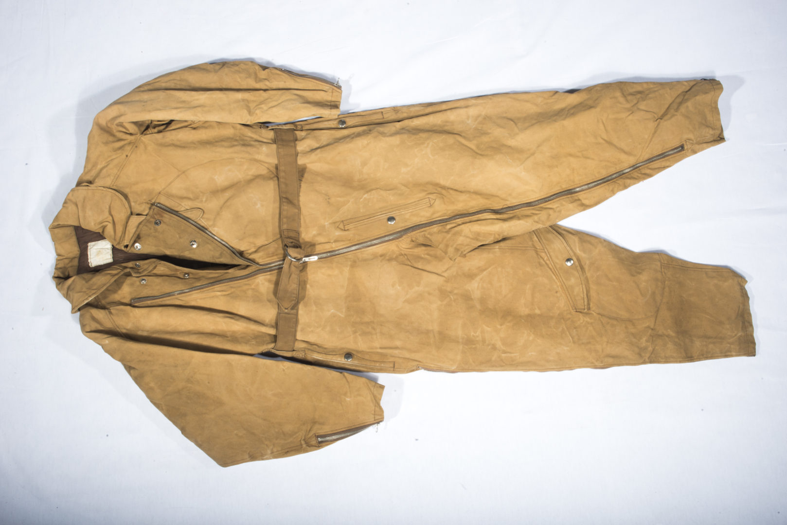 En toile jaune, doublure épaisse marron, peu servi, quelques taches, mais en Tbe. Etiquette illisible, fermetures Eclair fonctionnelles, avec sa ceinture d’origine