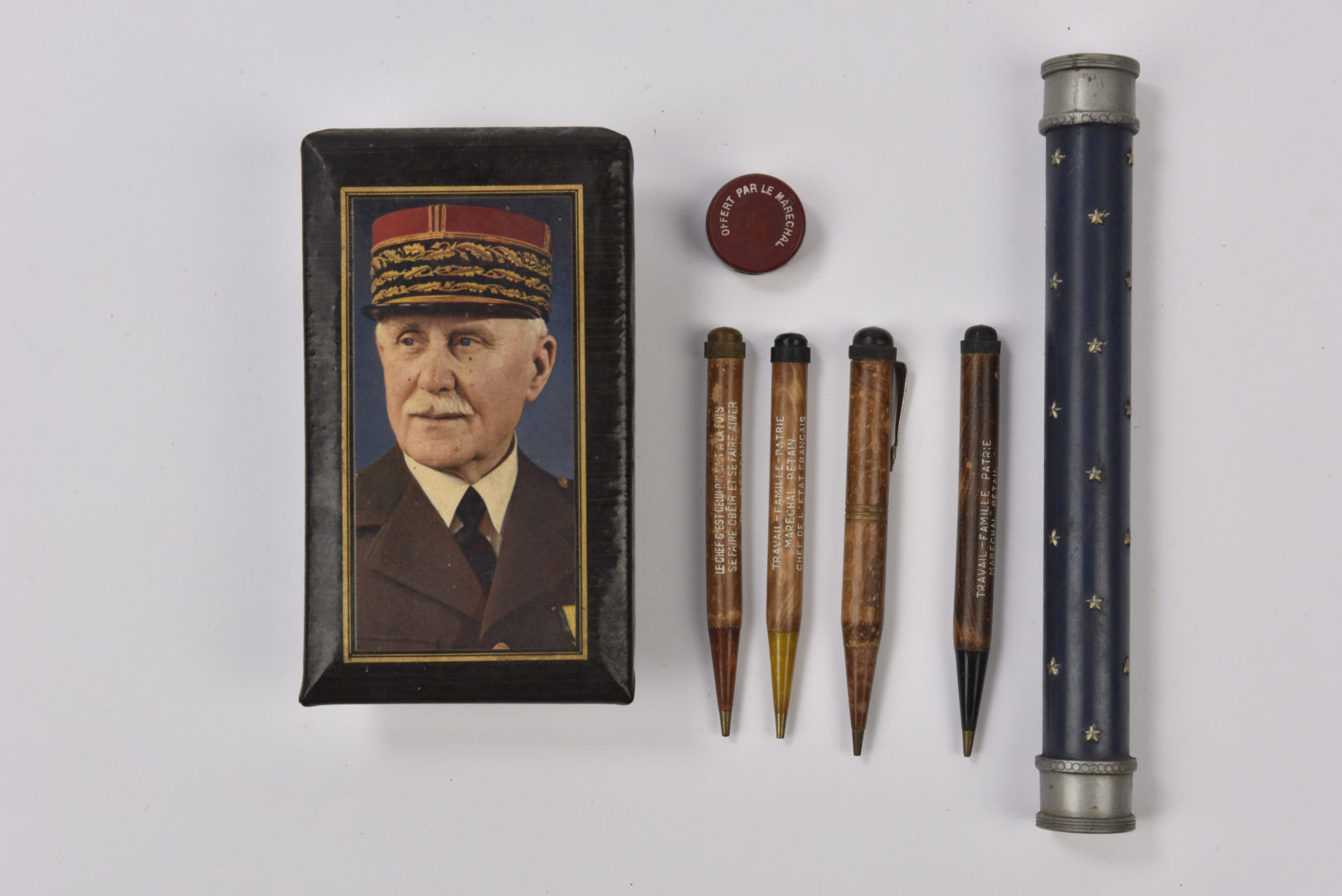 Une trousse pour enfant en forme de bâton de Maréchal de France, un taille-crayon rouge « Offert par le Maréchal », 4 porte-mines avec des maximes de Vichy, un rare tampon buvard... en savoir plus