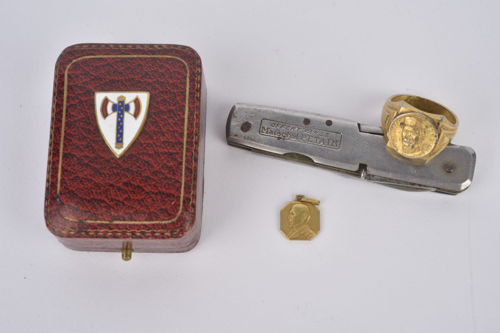 Composé de 3 pièces un canif en métal avec mention gravée « Offert par le Maréchal Pétain », une chevalière en métal doré avec médaille figurant un profil de Pétain, une boîte (couvercle avec un insigne à francisque) contenant la petite médaille en fix figurant le Maréchal Pétain