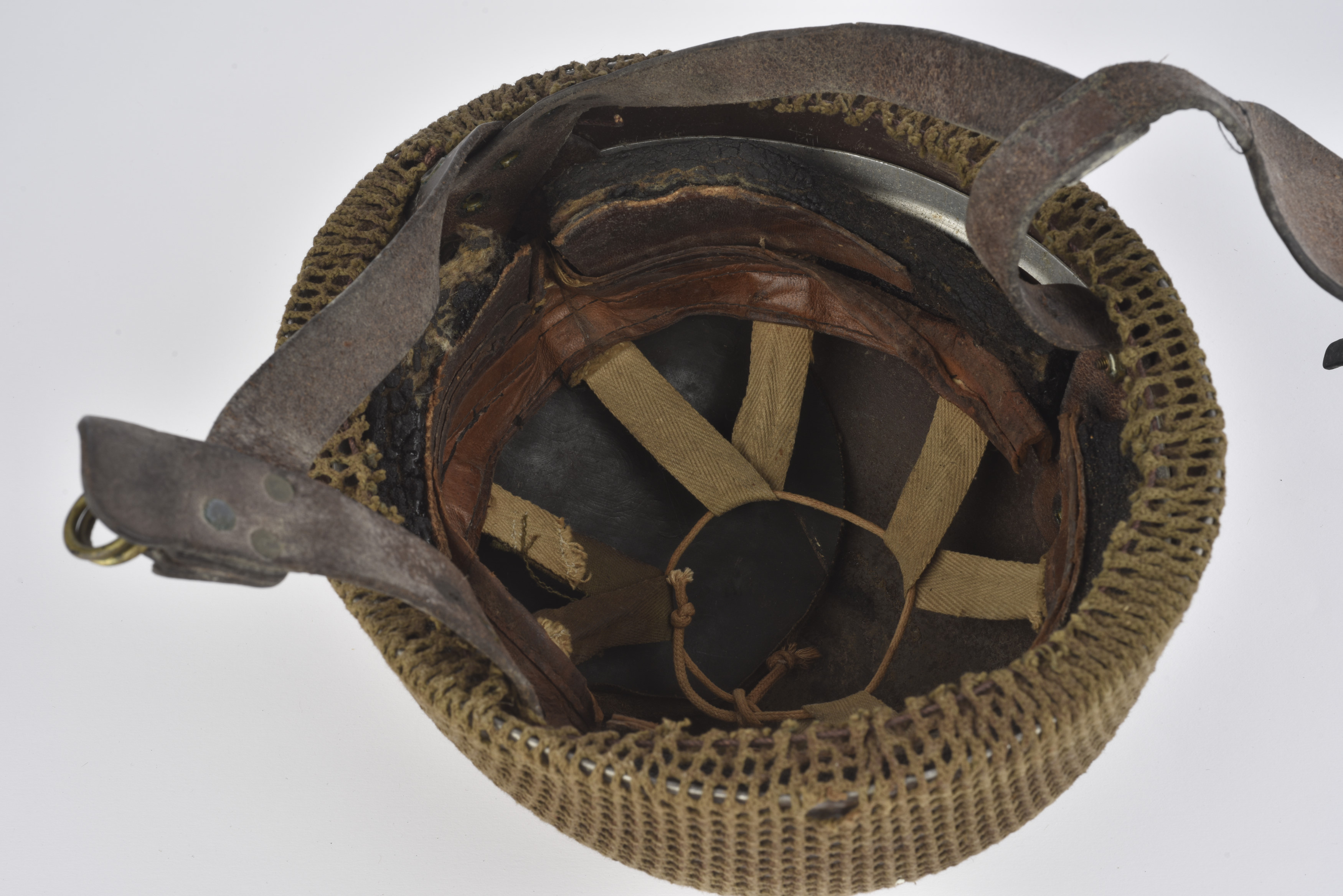 Coque en métal, peinture quasi absente. Filet de camouflage petites mailles. Intérieur présent. La mousse est fortement abîmée avec des manques, ainsi que le bandeau de transpiration en cuir... en savoir plus
