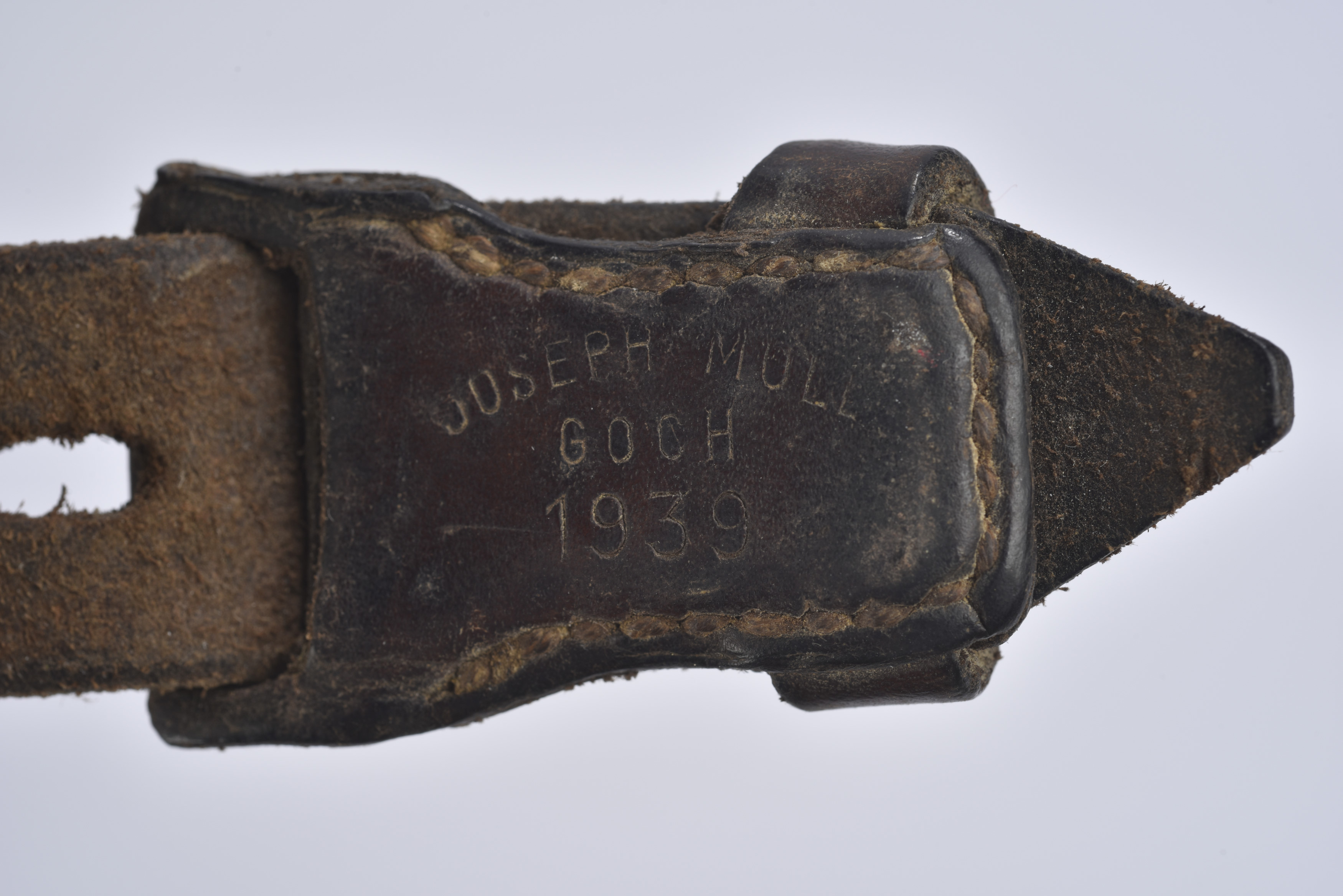 En cuir strié, complète, fabrication « Joseph Mull Goch 1939 ». A noter une certaine patine de la pièce