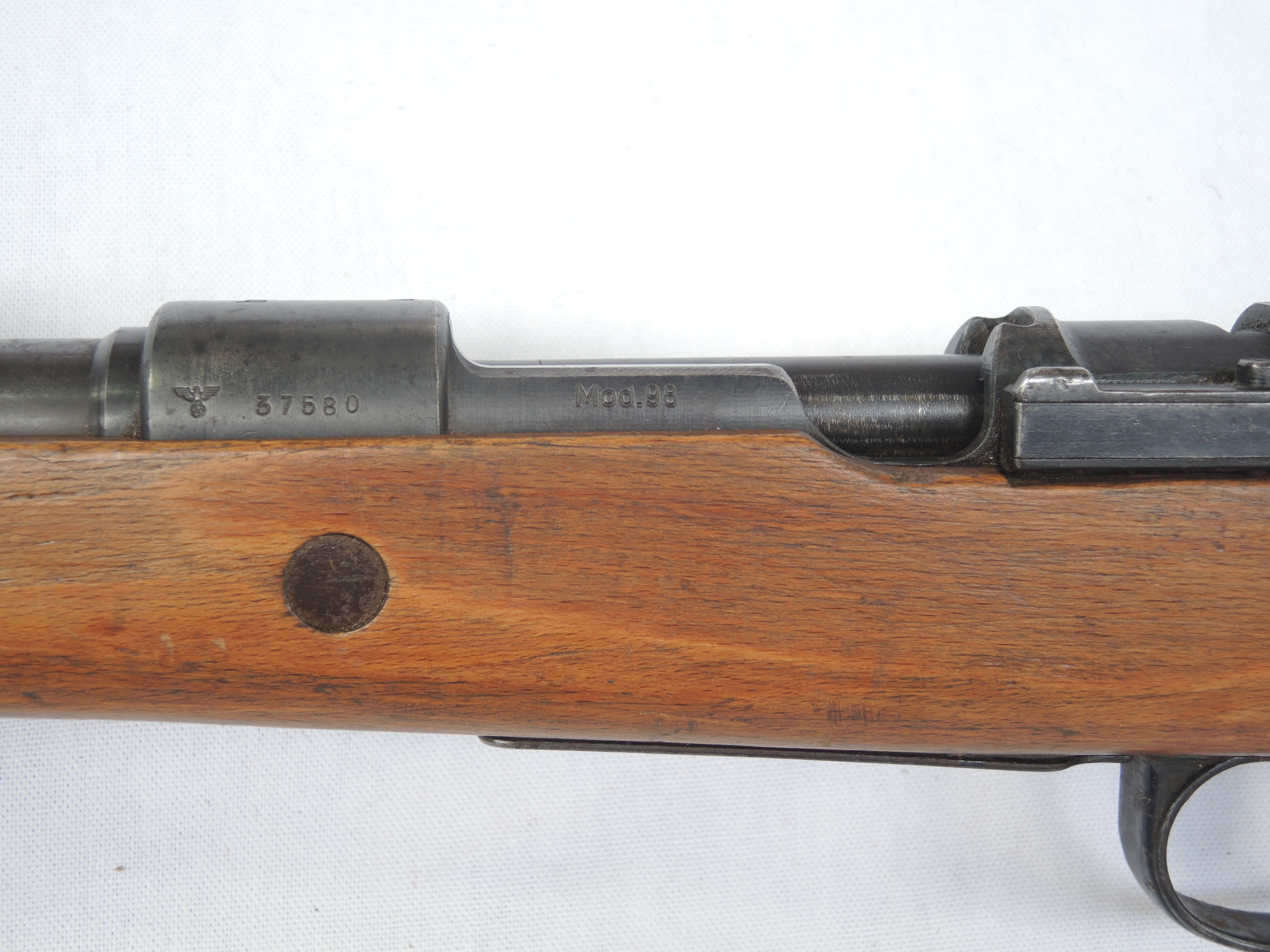 Crosse en bois, aigle du Waffenamt sur l’ensemble de l’arme. Fabrication « BYF 44 », numéro « 37580 », arme au même numéro. Hausse micrométrique. Baguette de nettoyage et tunnel de visé présents. Canon marqué « 43R », probable rechambrage. A noter de nombreuses marques d’usures et d’oxydation sur l’ensemble de la pièce. Le fonctionnement de l’arme n’est pas garanti. Arme délivrée aux détenteurs d’une licence de tir ou d’un permis de chasse et à déclarer en Préfecture. Pour les personnes non détentrices de cette catégorie il sera impératif de faire neutraliser l’arme par nos soins exclusivement, aux frais de l’acheteur suivant les nouvelles normes européennes du Banc d’Epreuve de Saint Etienne