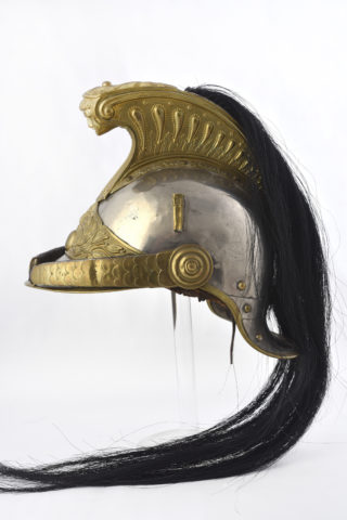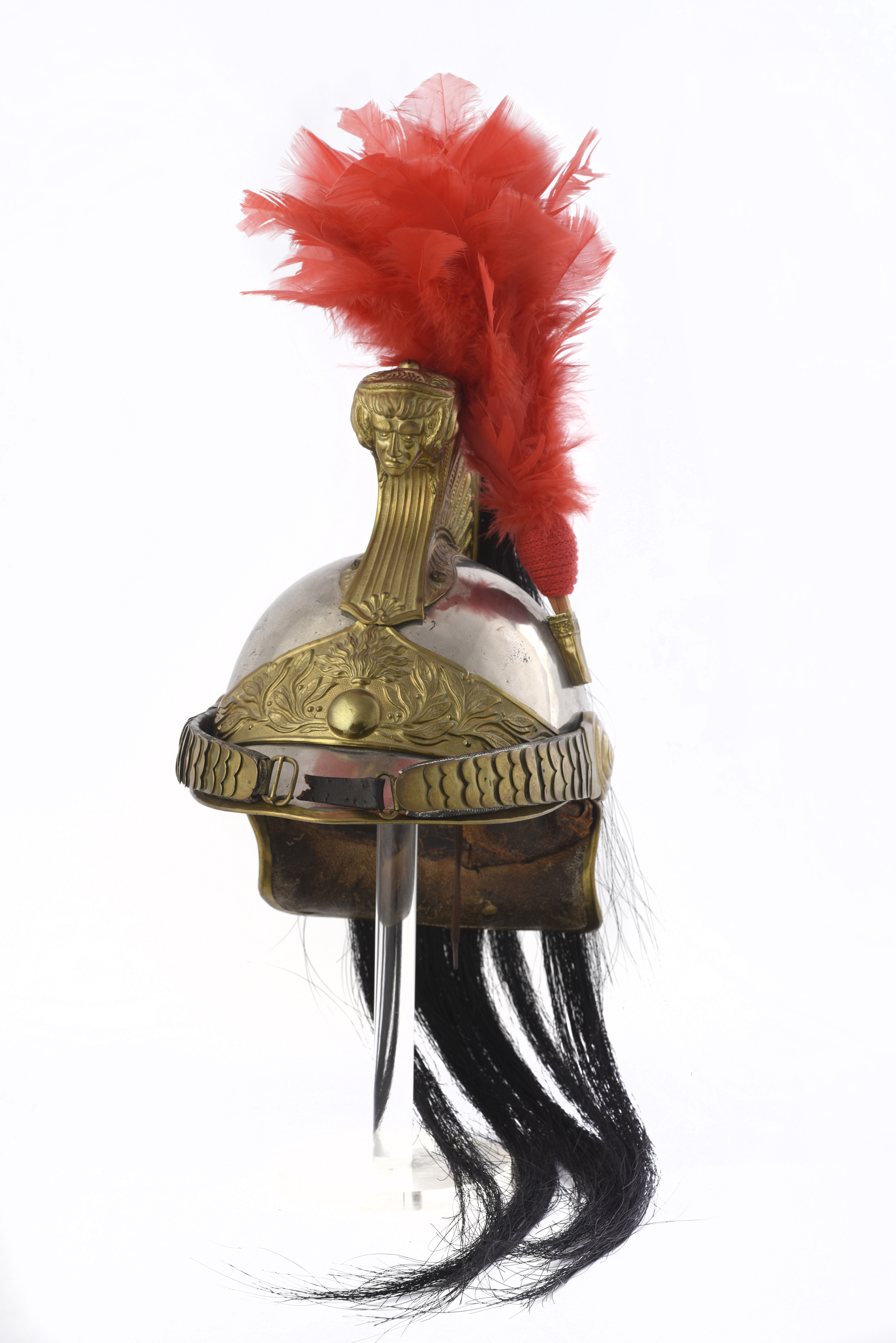 CASQUE TROUPE DU 10e RÉGIMENT DE CUIRASSIER REVERSÉ AUX DRAGONS, MODÈLE 1872 MODIFIÉ 1874, TROISIÈME RÉPUBLIQUECasque entièrement en acier.Il se compose d’une bombe, d’une visière et d’un couvre-nuque tous deux cerclés d’un jonc en laiton plié à cheval sur la bordure extérieure, d’un bandeau, de deux jugulaires, d’un cimier, d’une crinière en crins noirs d’environ 65 cm de longueur, et d’un porte-plumet. Toutes les garnitures sont en laiton. La bombe, d’une seule pièce emboutie, aucun poinços à l’arrière.Coiffe intérieure en cuir découpé en dents de loup en mauvais état. Assez bon état de conservation, acier piqué de manière uniforme.