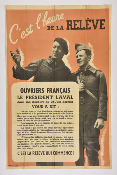 Affiche illustrée et de texte, ventant la relève par les ouvriers français de prisonniers français en Allemagne. « Oraff numéro 161 ». A été pliée. Dimensions 114x74cm