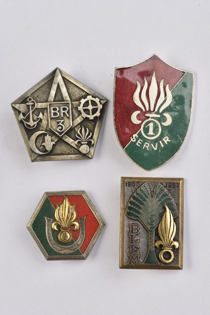 Composé du 21ème Régiment de Marche des Volontaires Etrangers (RMVE), modèle argent fabrication de 39/40 Dr Ber &déposé, du Bataillon de la Légion Etrangère à Madgascar (B.L.E.M) DP.homologG1438 dos lisse doré, de la 1er Compagnie Sahararienne Portée de Légion (CSPL) modèle vert foncé à gauche et rouge brique à droite et chiffre « 1 » en creux dans grenade doréee pleine et en relief, fabrication DP guilloché irrégulier, du Bataillon de Réparation N°3 (BR3) fabrication DP Ber & Déposé.