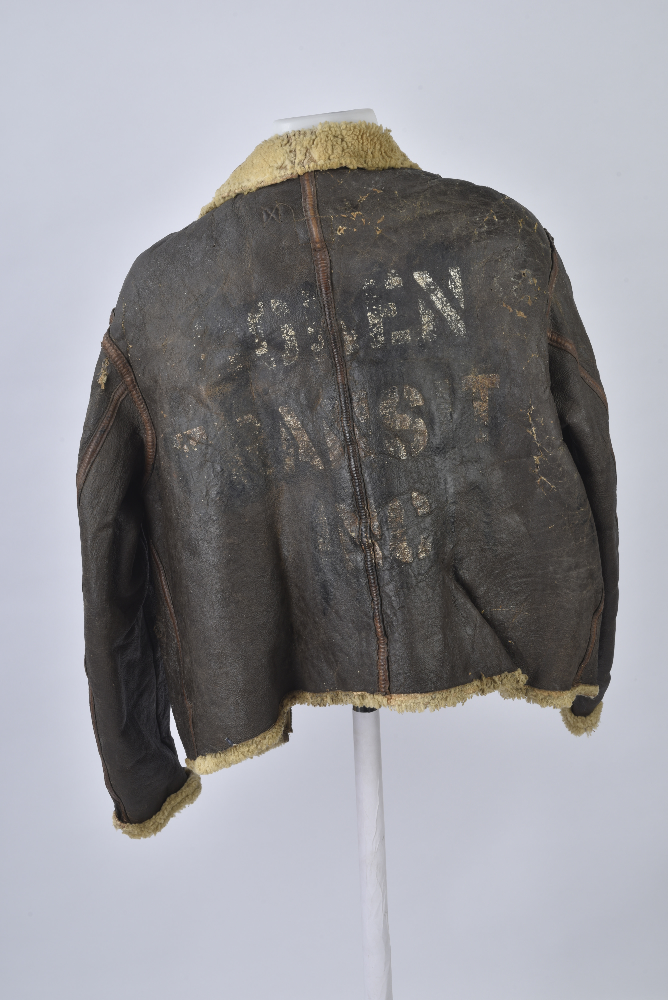 Blouson en cuir marron, doublé de fausse fourrure. Fermeture éclaire incomplète. Etiquette dans le col indiquant un modèle « D-1 », daté 43, taille Large. Personnalisation au niveau de la... en savoir plus