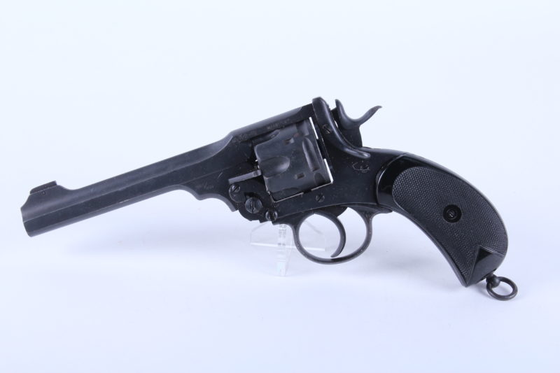Calibre 455 Webley. Bronzage à 90% visiblement postérieur. Plaquettes en bakélite noire. Marquages « Mark V ». Numéro « 204543 ». A noter quelques marques d’usures sur l’ensemble de la pièce. Le fonctionnement de l’arme n’est pas garanti. Arme délivrée aux détenteurs d’une autorisation de catégorie B. Pour les personnes non détentrices de cette catégorie il sera impératif de faire neutraliser l’arme par nos soins exclusivement, aux frais de l’acheteur suivant les nouvelles normes européennes du Banc d’Epreuve de Saint Etienne.