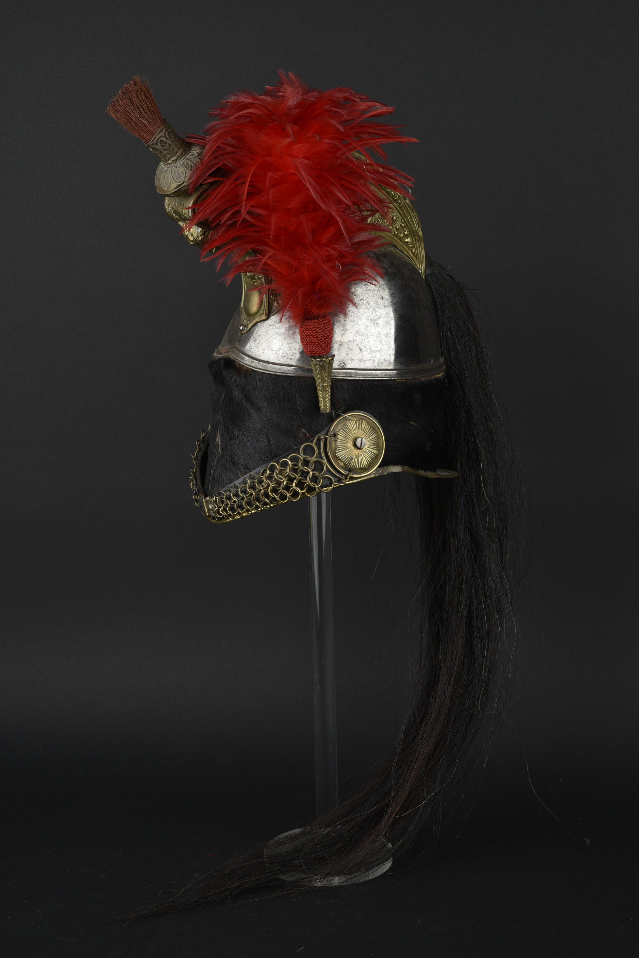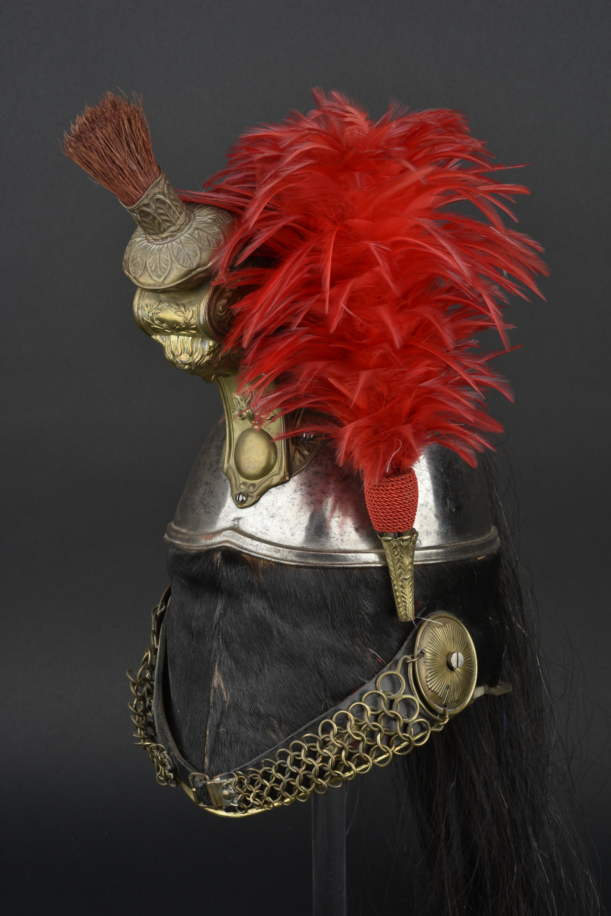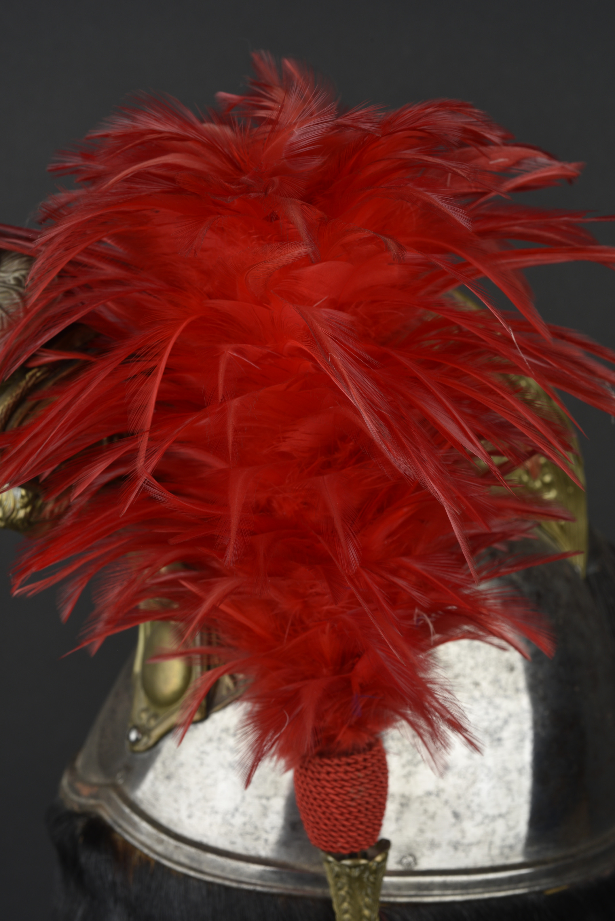 Plumet et olive écarlates. Daté de 1854 sur l’arrière de la bombe, marquage régimentaire illisible. Coiffure homogène en assez bon état.
