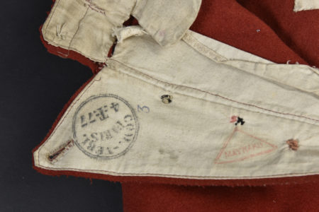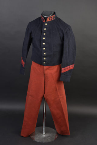 Capote modèle 1877 en drap gris de fer bleuté de caporal du 139e régiment d’infanterie, marquages intérieurs du 92e régiment et de la 13e section de commis et ouvriers militaires d’administration, fabrication Godillot 1878. Tunique modèle 1871 (collet jonquille) du 92e régiment, bons marquages (manquent 4 boutons). Veste de caporal du 139e régiment, marquage du 92e régiment. Pantalon garance de troupe modèle 1867, fabrication Godillot 1877. Ces effets ont pour point commun de se rattacher au 13e Corps de Clermont-Ferrand, garnison de la 13e COA, et sans doute à la ville d’Aurillac. Vers 1886, le 92e y possède son dépôt et c’est à Aurillac que le 139e sera affecté en 1889, date à laquelle le 92e gagne Clermont-Ferrand. Bon état général.