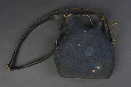 Avec housse en drap gris de fer bleuté et courroie en cuir noir.