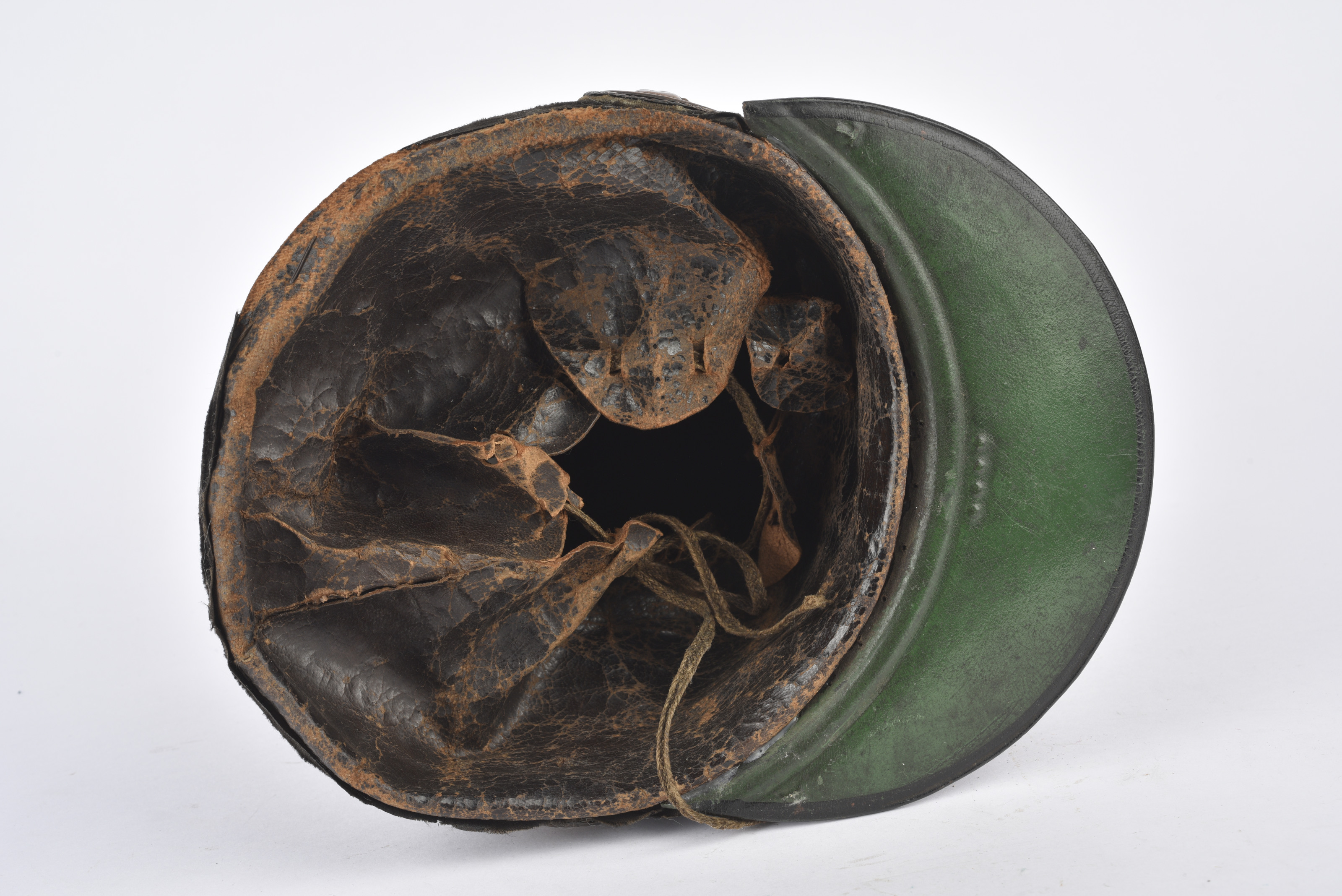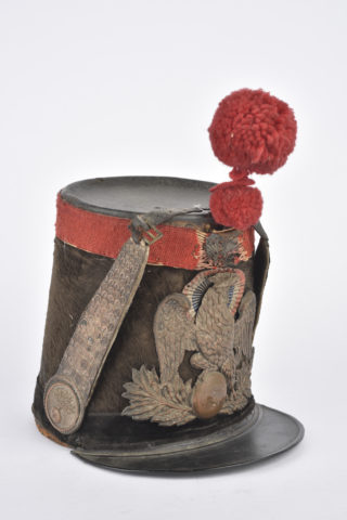 Plaque au coq et jugulaires métal blanc, corps recouvert de tissu de soie, galon et pompons écarlates. Etat moyen.
