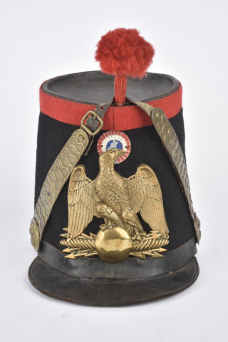 Carcasse drap noir, galon supérieur garance, jugulaire laiton, reconstitution de costumier, XXe siècle.