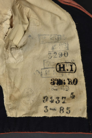 En drap bleu foncé, tressage garance, faisses poches en drap blanc. Veste avec marquage régimentaire, marquage de réception de 1882 et marquages d’affectation (1883-1886). Bon état.