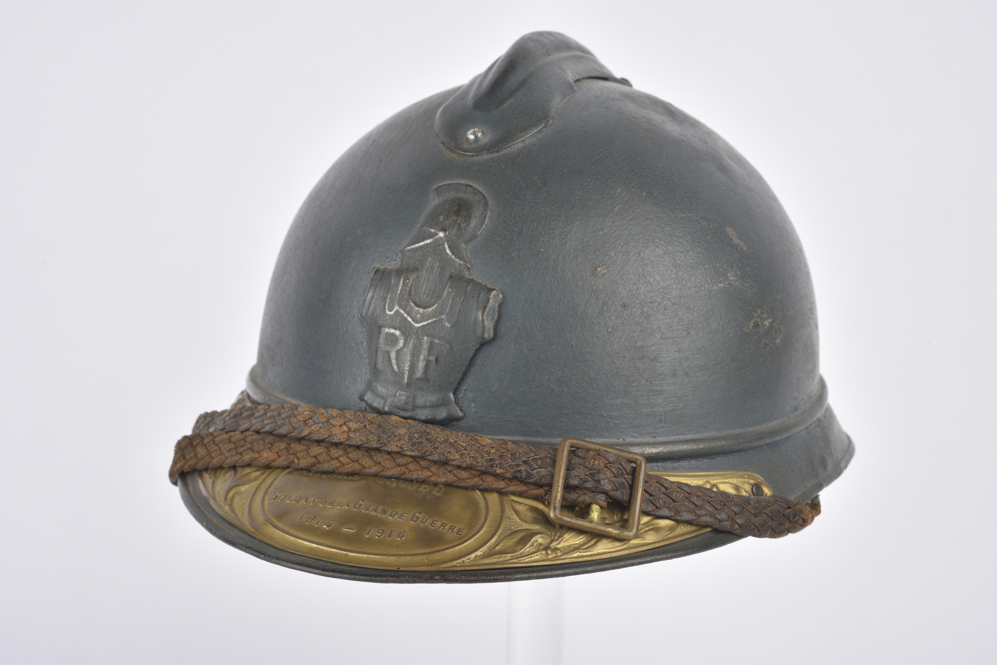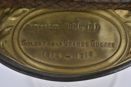 Jugulaire tressée, plaque commémorative en laiton sur la visière avec inscription Capitaine Brunel, soldat de la Grande Guerre 1914-1916. Intérieur à rendre solidaire avec la bombe mais bon... en savoir plus