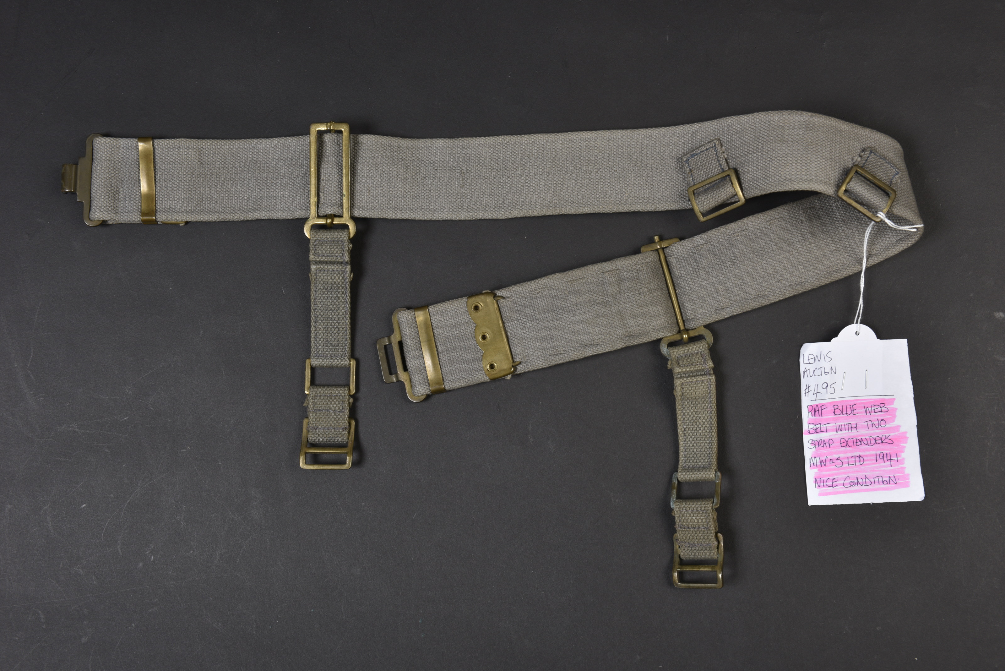 Ceinturon en toile web bleue. Taille S, fabrication MW&S 1941. On y joint deux extensions de bretelle en toile web bleu. Ensemble homogène. Pièces neuves de stock. With two strap extenders.... en savoir plus