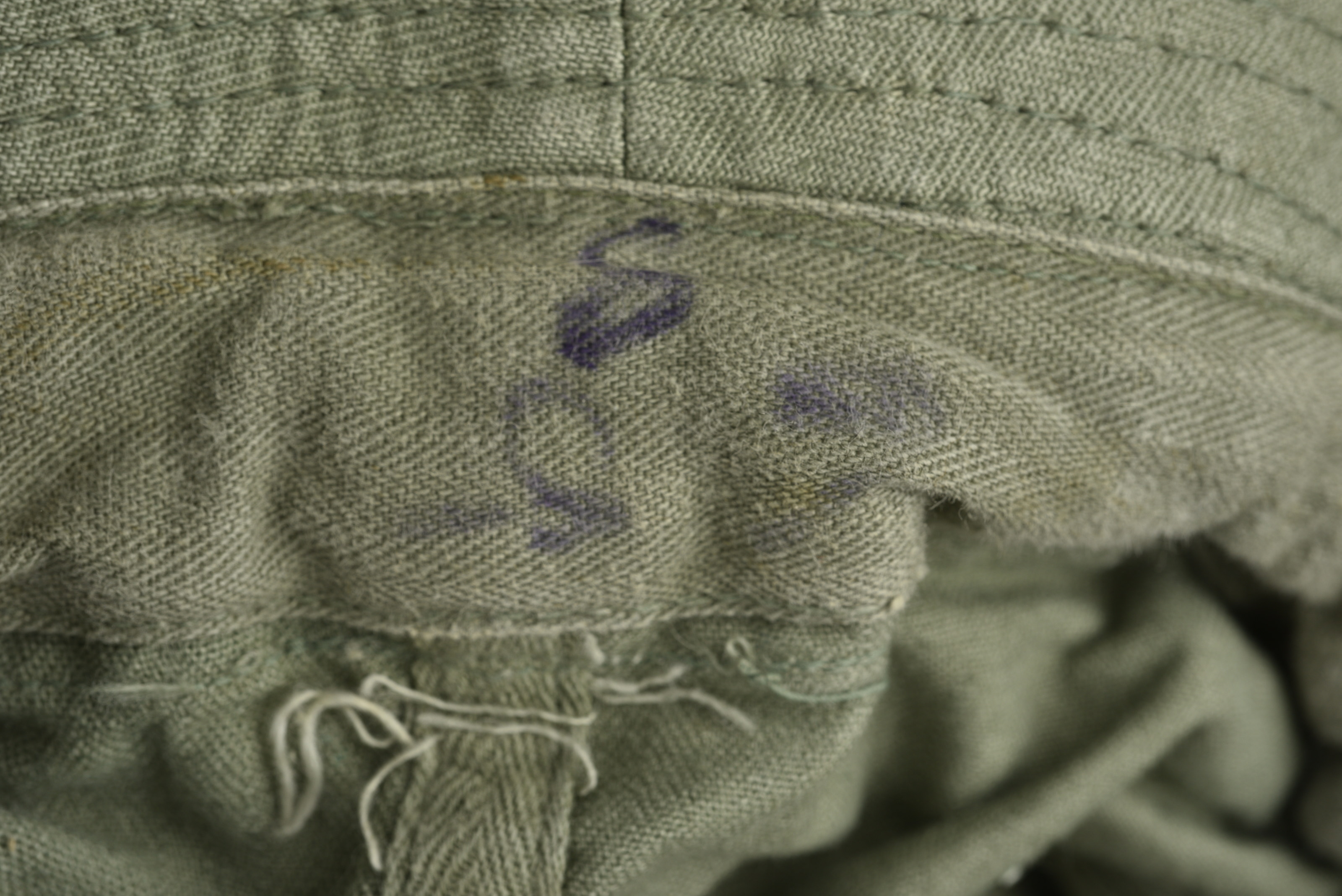 En tissu HBT OD, couleur claire. Etiquette présente, mais en mauvais état, fabrication Continental Hat & Cap. Datée novembre 1942, taille 7 3/4. A noter une légère patine de la pièce.... en savoir plus