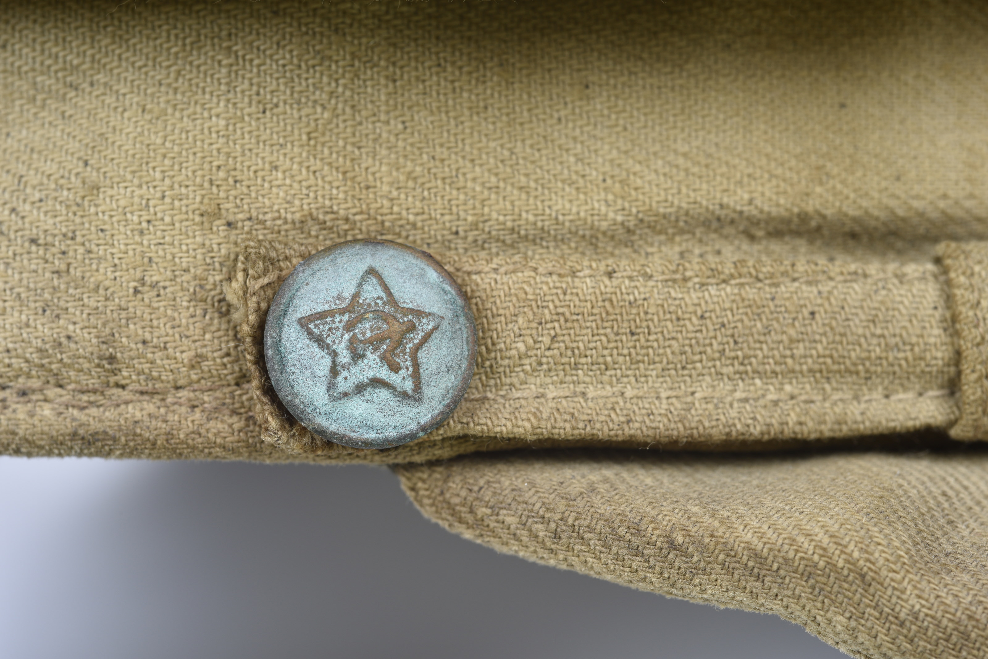 Modèle avant-guerre, étoile verte (régulation de août 1941), jugulaire toile, portée, taille 56/57, coiffe typique du Frontovik. Combat cap canvas, model before war, green star (regulation of... en savoir plus