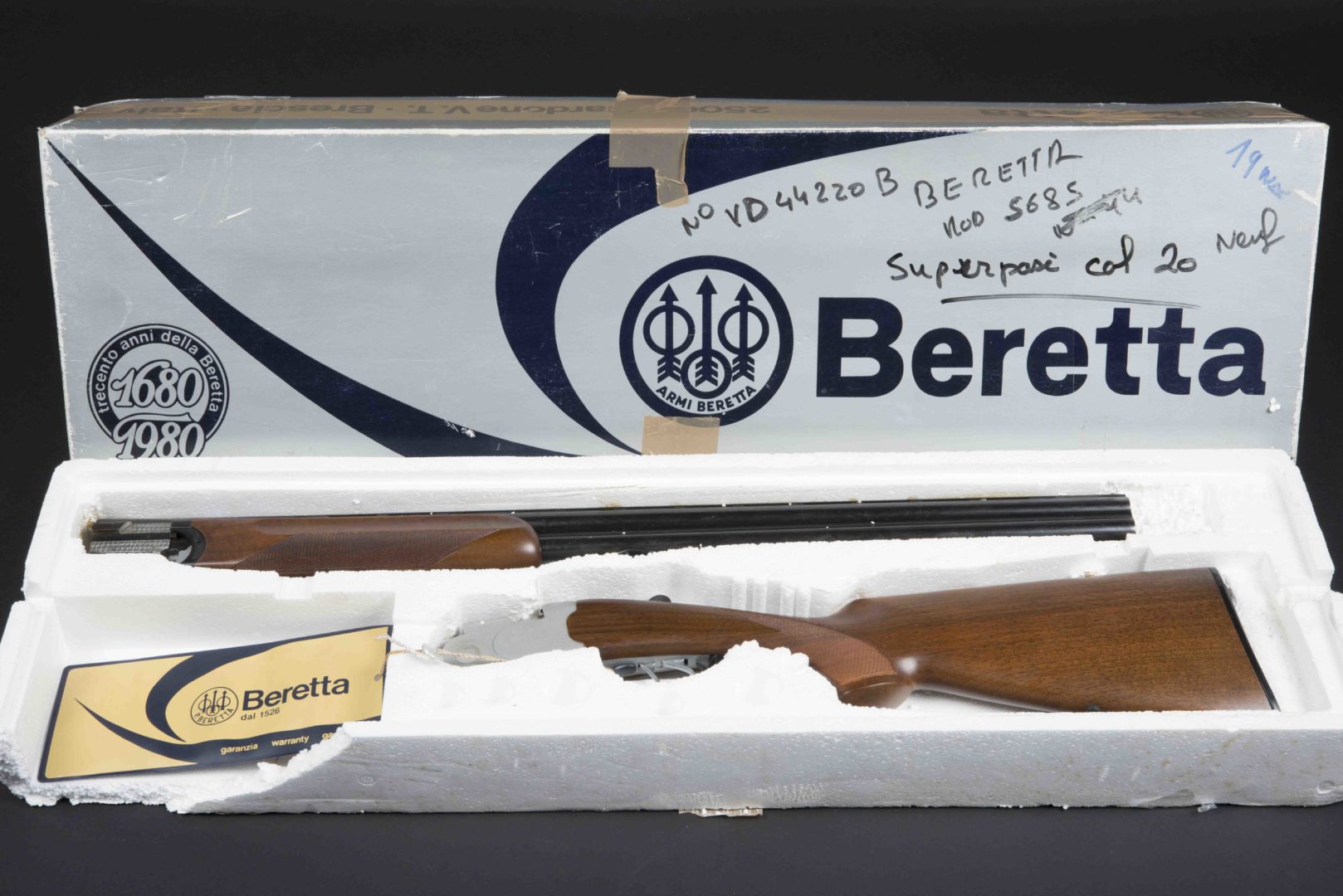 Modèle 5685. Calibre 20. Numéro VD44220B. Fabrication P Beretta Gardone VT. Neuf jamais monté, dans son carton d’origine. Provenant des anciens stocks de l’armurerie Angot fermée en 1991. Arme délivrée aux détenteurs d’une licence de tir ou d’un permis de chasse et à déclarer en Préfecture. Pour les personnes non détentrices de cette catégorie il sera impératif de faire neutraliser l’arme par nos soins exclusivement, aux frais de l’acheteur suivant les nouvelles normes européennes du Banc d’Epreuve de Saint Etienne. Fonctionnement de l’arme non garantie.