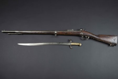 Platine de la Manufacture impériale de St-Etienne, hausse type 1859 graduée jusqu’à 1100m, avec sabre-baïonnette sans fourreau. Bon état.