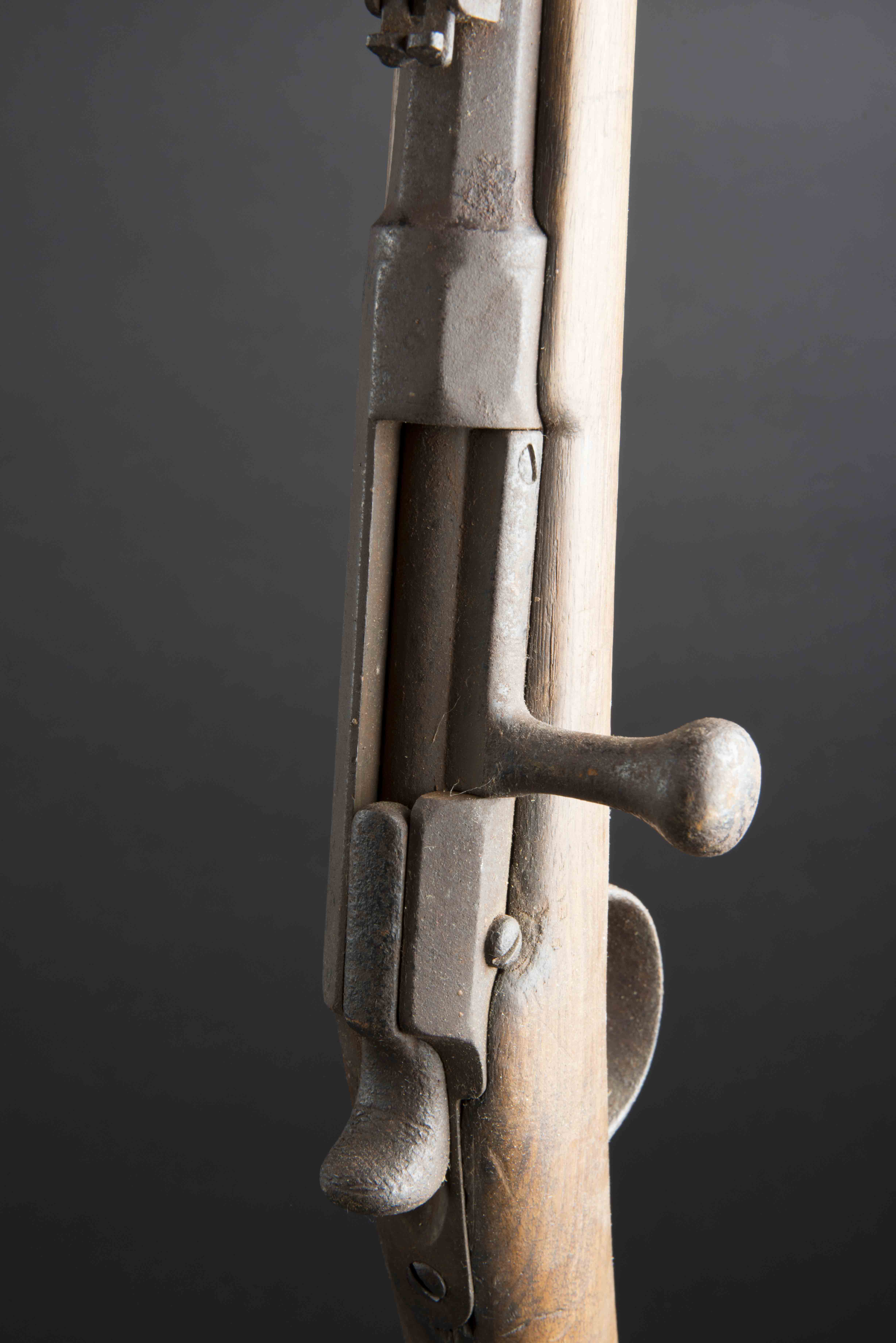 Crosse bois, hausse réglable, aucuns marquages visibles. Numéro illisible. Pièce fortement oxydée. Baguette de nettoyage présente.