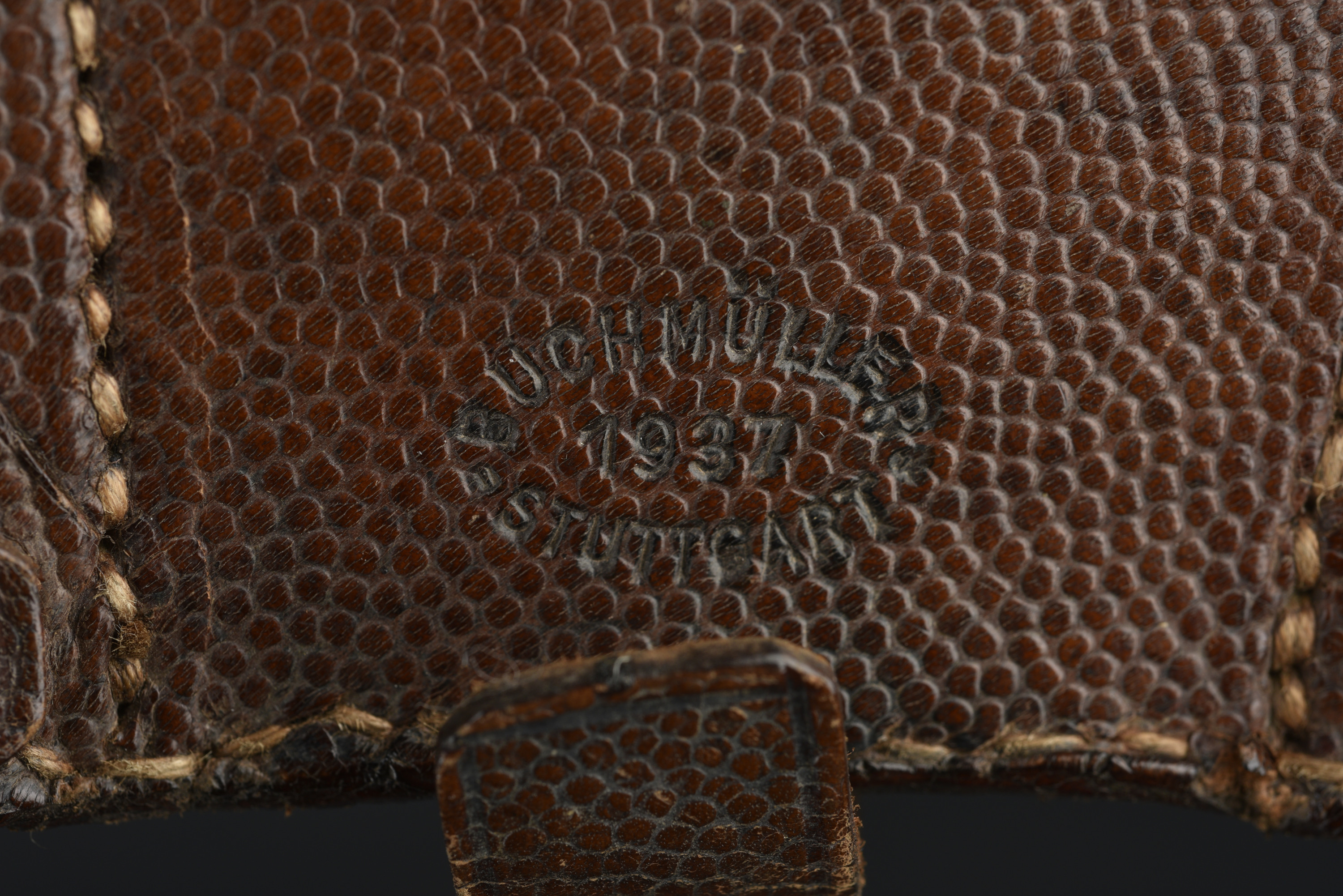 En cuir noir tirant sur le marron. Datées 1937 et 1940. A noter quelques marques d’usures sur l’ensemble des pièces.