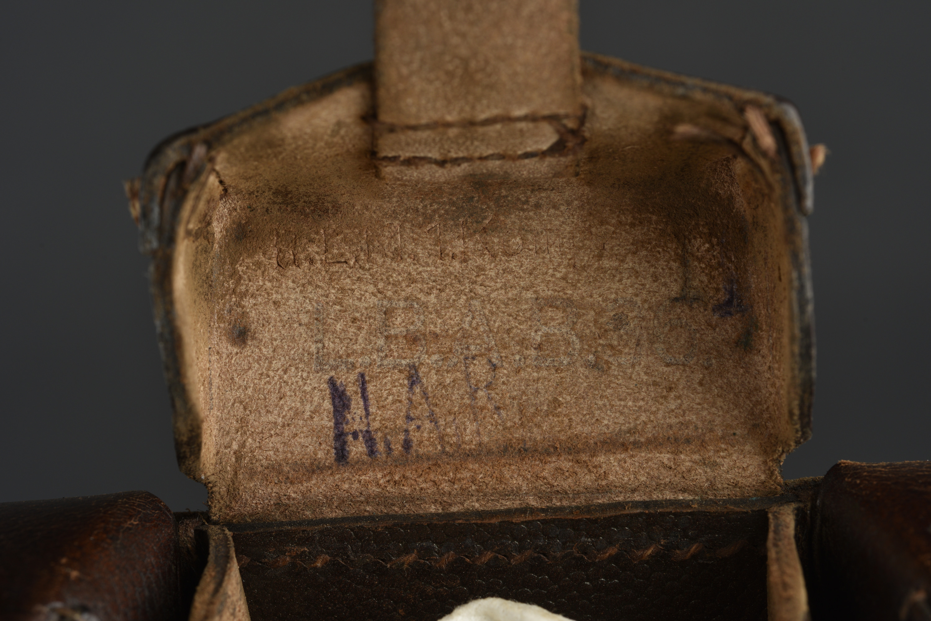 En cuir noir tirant sur le marron. Datées 1936 et 1938. Marquages sous un rabat LBA S 39. A noter quelques marques d’usures sur l’ensemble des pièces.