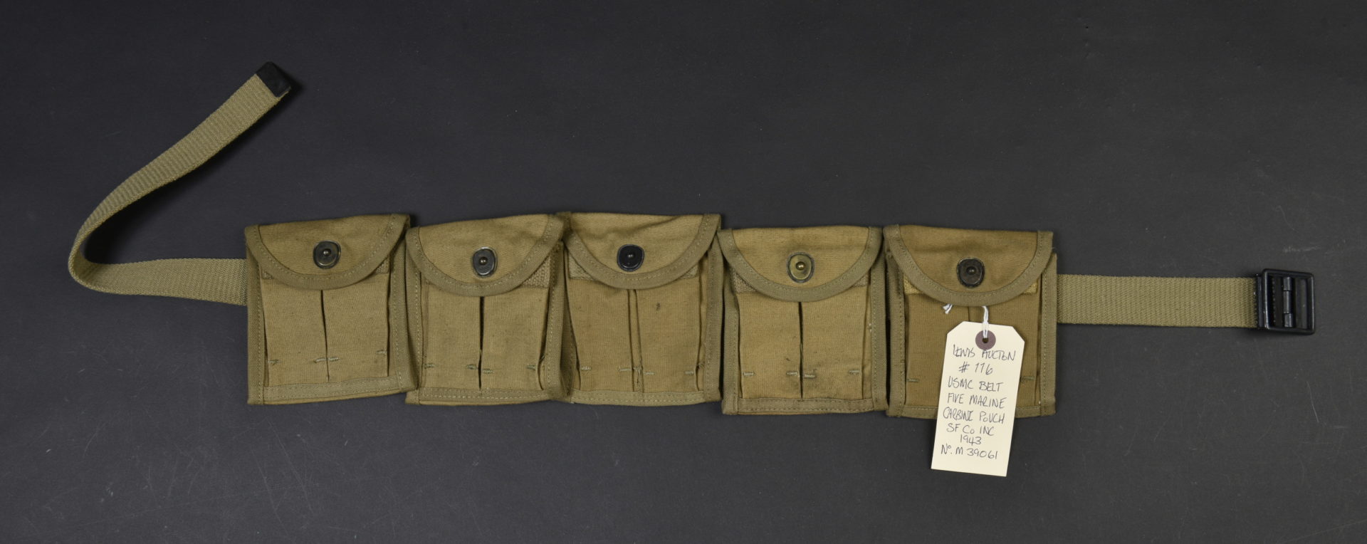 Ceinture en toile kaki, boucle réglable. Cinq boutons pressions permettant la fixation de cartouchières. Cinq cartouchières en toile fabrication SF CO Inc 1943, No m 39061. Ensemble homogène,... en savoir plus