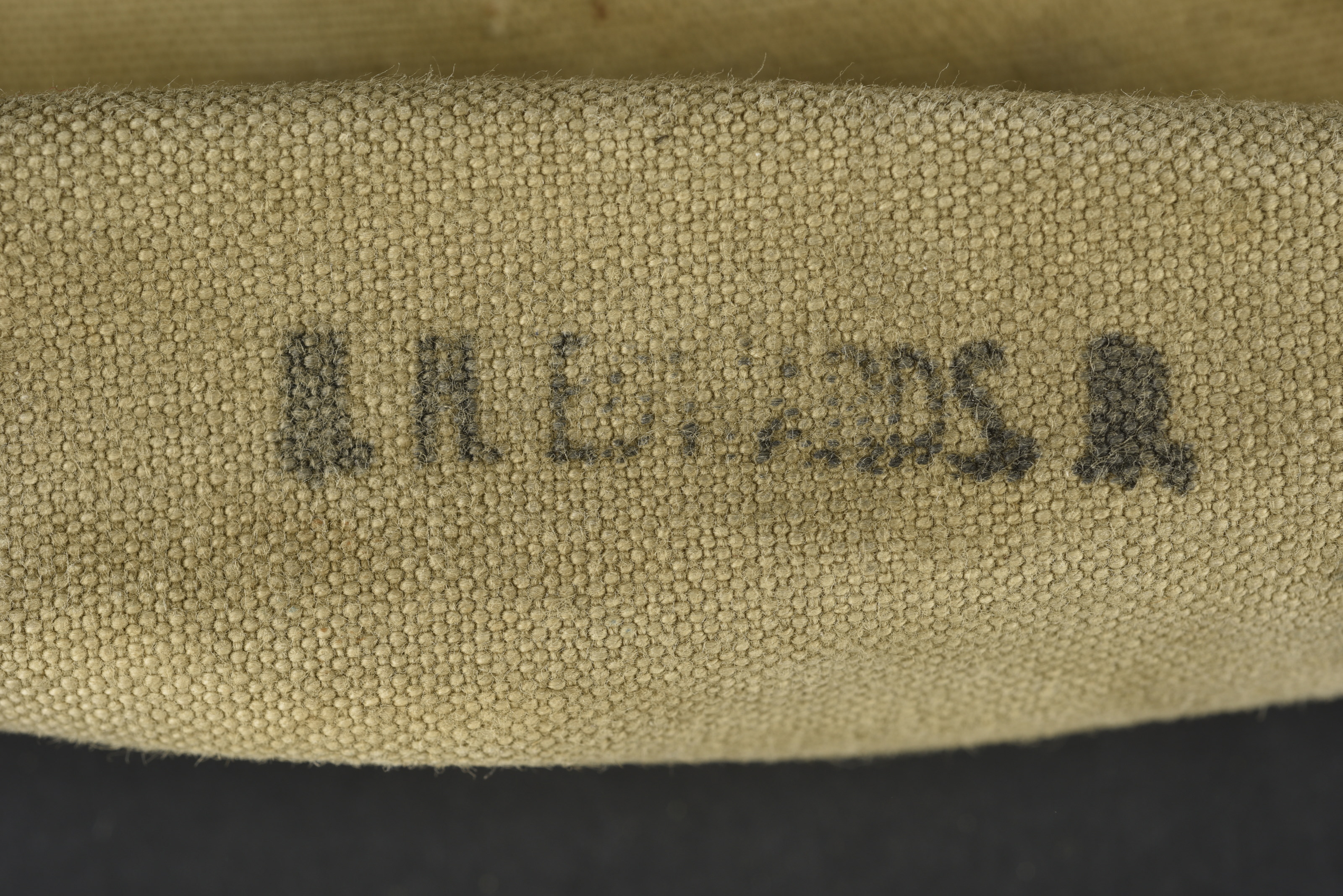 En toile OD bicolore, fermeture des rabats par boutons pressions. Aucuns marquages visibles. Indication nominative illisible. A noter quelques marques d’usures sur l’ensemble de la pièce. Glove snaps, no bottom hole, named on bottom. C’est sans doute, l’une des collections les plus importantes de matériel de l’armée américaine en Europe. C’est, sans doute, également la plus prestigieuse. Kenneth Lewis avait 8 ans lorsqu’il acheta sa première pièce de militaria en Angleterre. Cette passion l’amena à constituer une considérable collection dont la plupart des objets, neufs de stocks, constituèrent avant l’heure un catalogue raisonné pratiquement complet de l’équipement de l’armée des États-Unis d’Amérique. L’importance de ce fonds amena ses amis à le convaincre d’écrire un livre sur le sujet. Ce fut la première bible sur le sujet intitulé From Doughboy to GI publié en 1993. Ce livre devint la référence sur le thème pour les milieux anglo-saxons du monde entier. La plupart des objets présentés dans le livre feront d’ailleurs partie de la vente. It is, doubtless, one of the most important collections of material of the American army in Europe. It is also the most prestigious. Kenneth Lewis was 8 years old when he bought his first piece of militaria in England. This passion brought him to establish a considerable collection most of which of the objects, new of stocks, constituted prematurely a practically complete reasoned catalog of the equipment of the army of the United States of America. The importance of this collection brought his friends to convince him to write a book on the subject. It was the first Bible on the entitled subject From Doughboy to GI published in 1993. This book became the reference on the theme for the Anglo-Saxon circles of the whole world.?Most of the objects presented in the book.