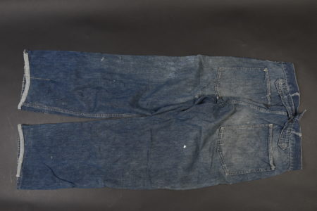 En denim bleu, incomplet, présetnant de nombreuses marques d’usures. Pièce pouvant servir pour la réparation d’un autre pantalon en denim. Pièce terrain. Heavily damaged, good... en savoir plus