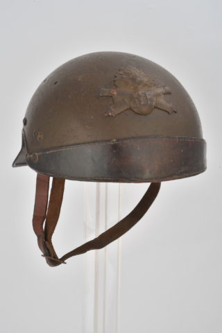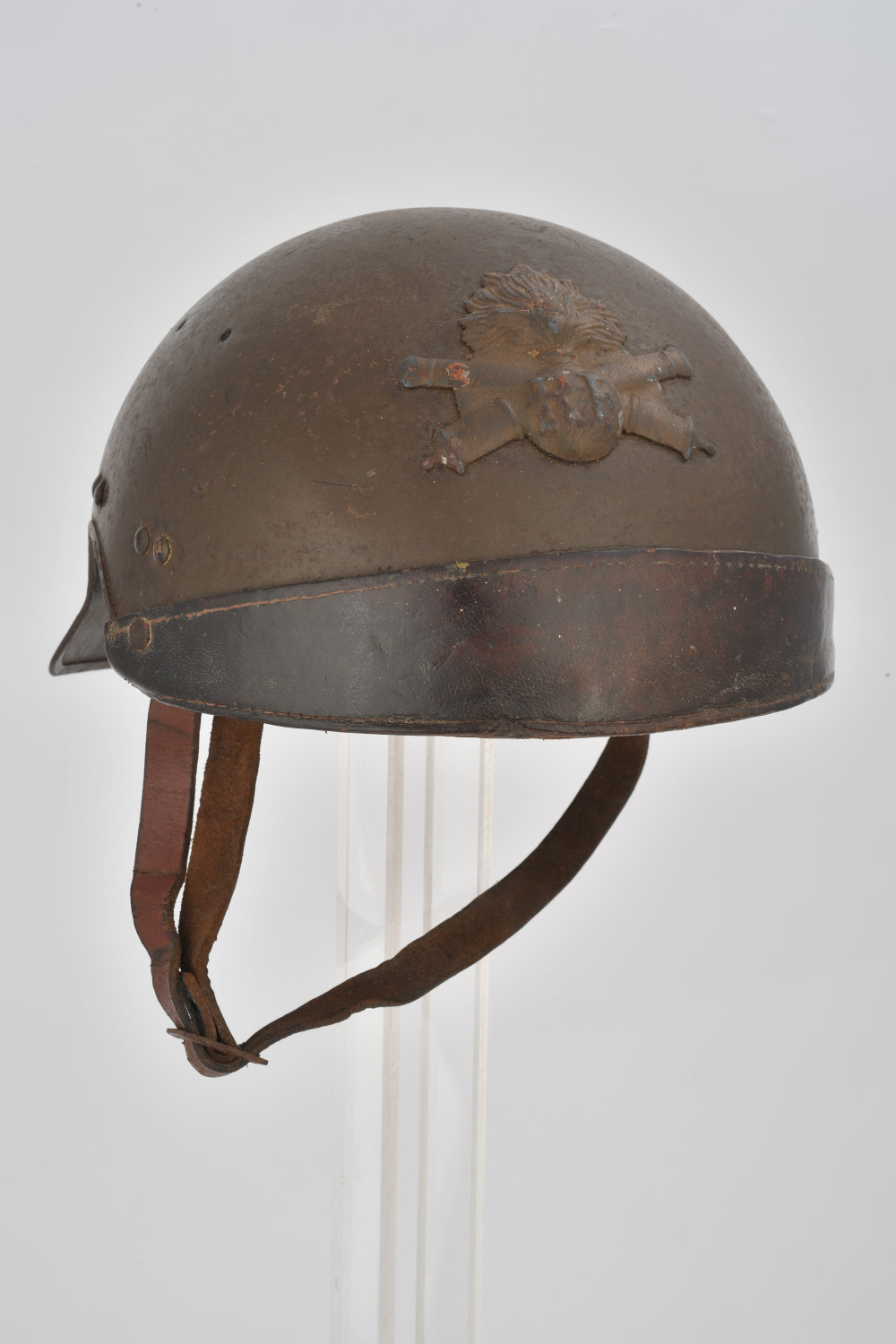 Casque Français modèle 1936 de la DCA avec insigne de l’artillerie modèle 15. Coiffe bien du modèle, en état moyen avec quelque trou, jugulaire réparée, fil de fer au lieu du bouton... en savoir plus