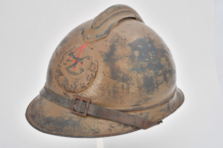 Rare casque français Adrian modèle 1915 du 4ème Zouave. Moutarde (sur peinture bleue horizon), insigne 4eme Zouave artisanal en tôle rehaussée de rouge sur le 4 et de bleu sur le Z. Coiffe en... en savoir plus