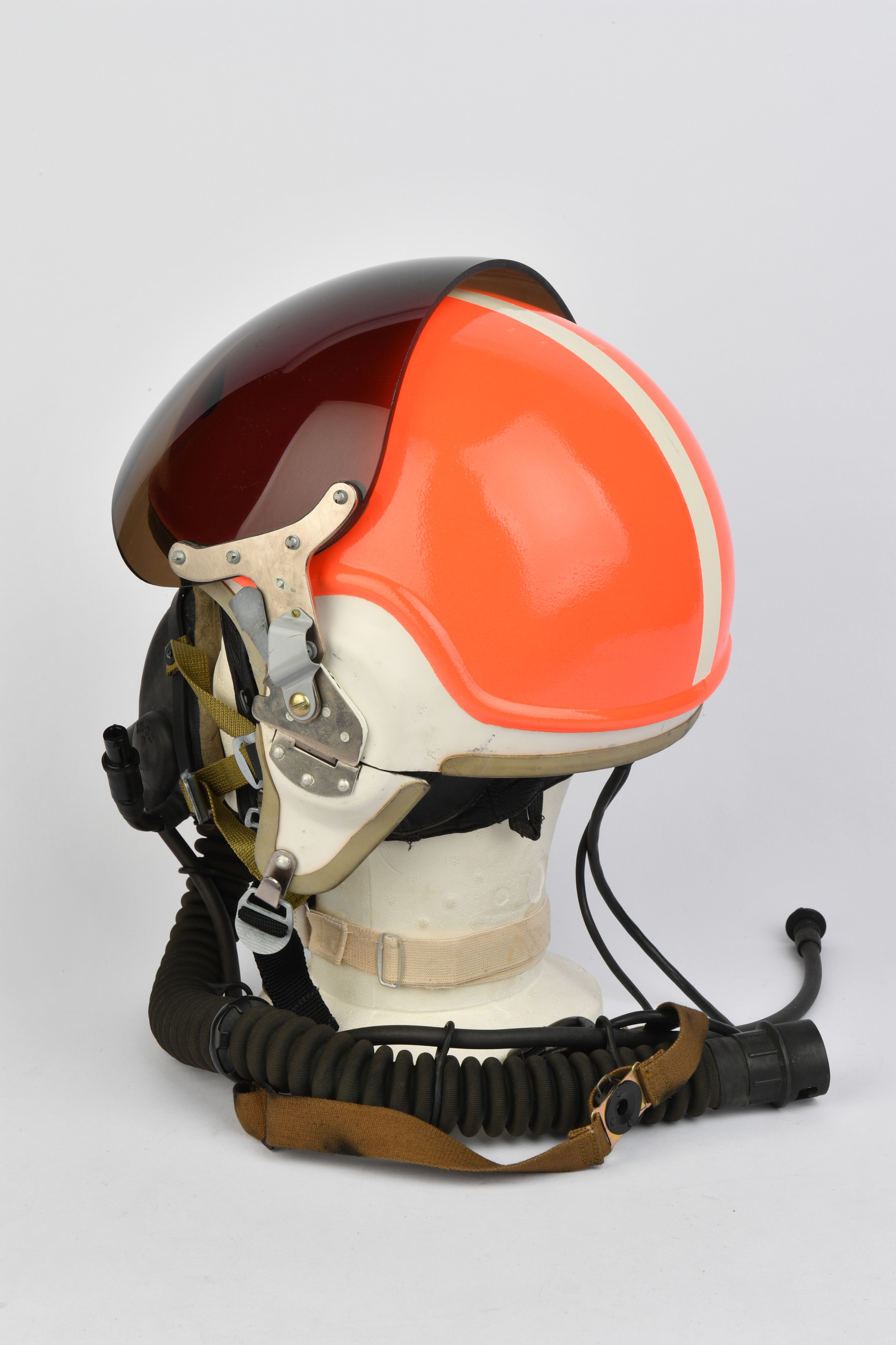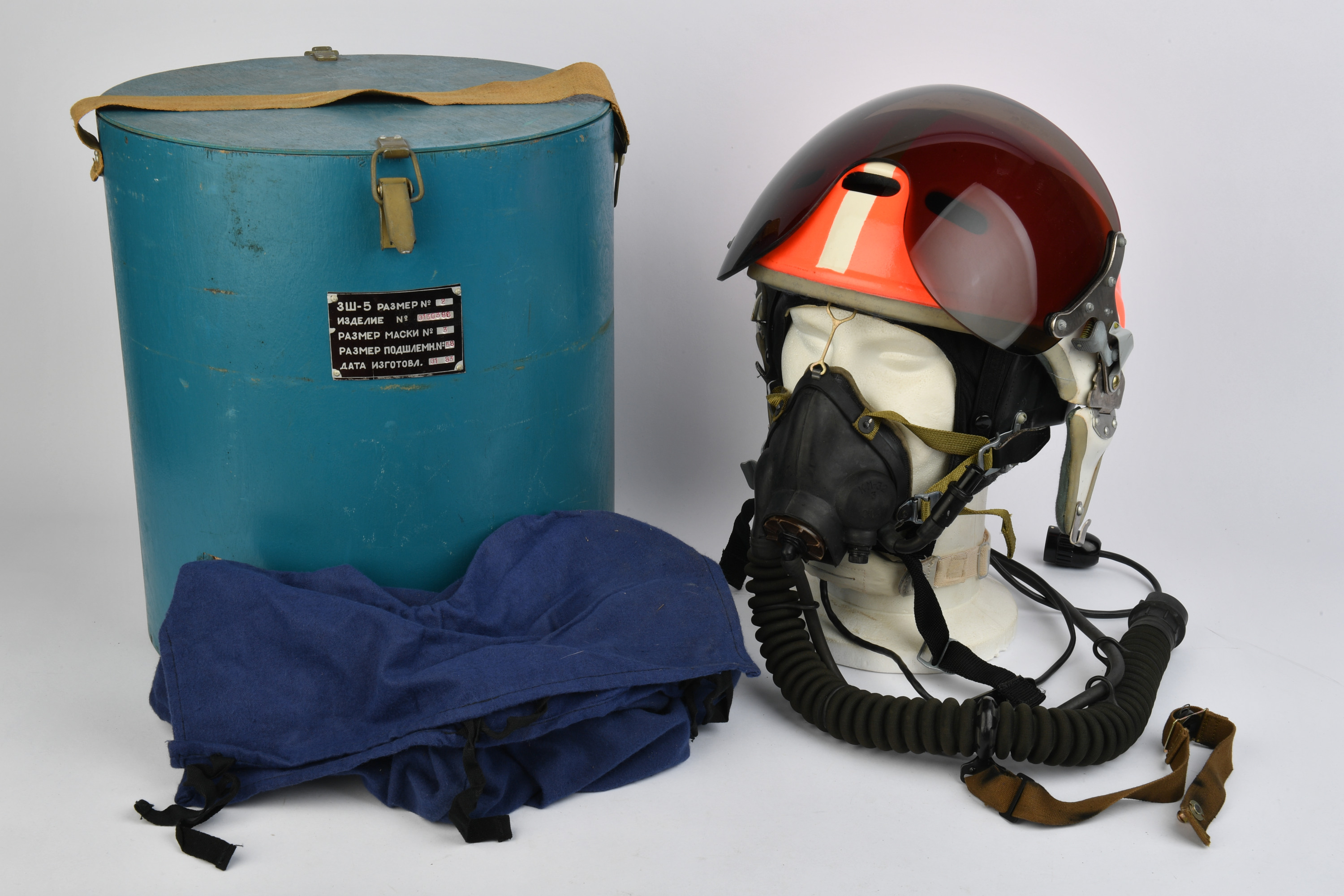 Casque pilote soviétique 3ш-5, dans sa boite d’origine en bois et sa housse. Comprenant la coque de casque en fibre avec visière, le sous-casque/ serre-tête avec écouteurs et laryngophone et le masque respiratoire. Version modernisé du N° 179, apparu fin des années 60 utilisé par les pilotes de MIG.21 ainsi que par les pilotes d’hélicoptères.