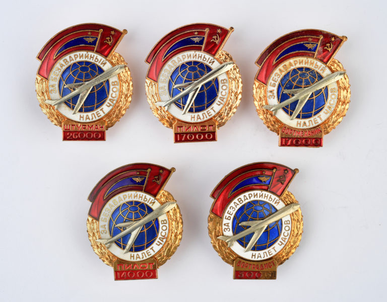 Lot de 5 insignes de pilote de l’aviation civile pour des heures de vol sans accidents (7000 -7000 -8000 – 14000 – 25000 km)