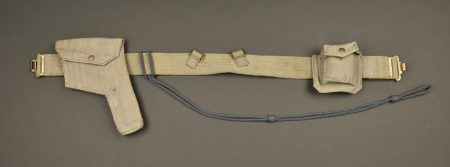 Accessoires RAF. Comprenant un ceinturon en web bleu, bouclerie en laiton, marquages illisibles. Un holster de pistolet Webley, en web bleu, bouton pression fonctionnel, fabrication MECO 1940, AM...