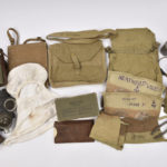 Comprenant une pelle pliante avec sa housse datée 1943. Une housse de pelle pliante datée 1944. Une vache à eau datée 1945. Un reste de musette médic. Une gourde en plastique datée 1943. Une...
